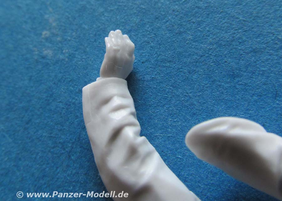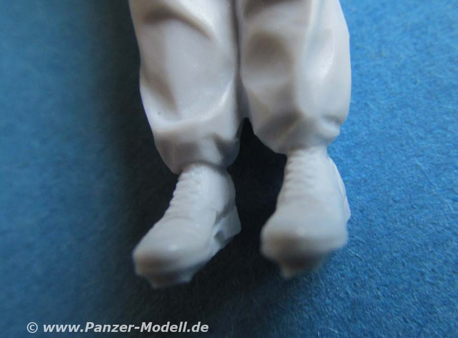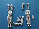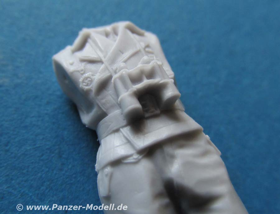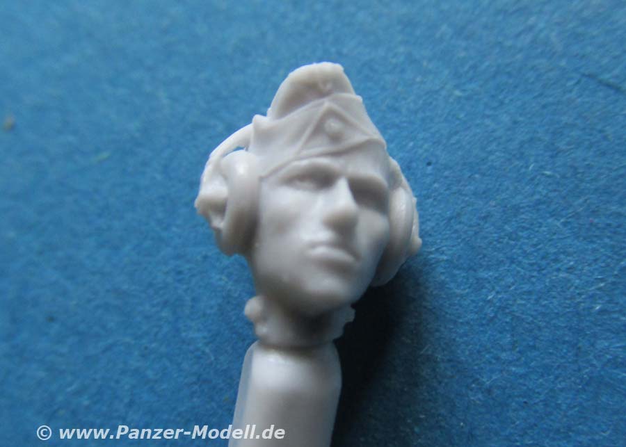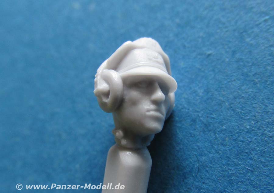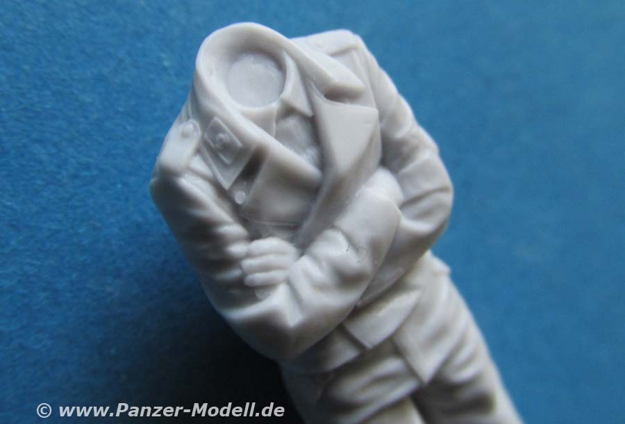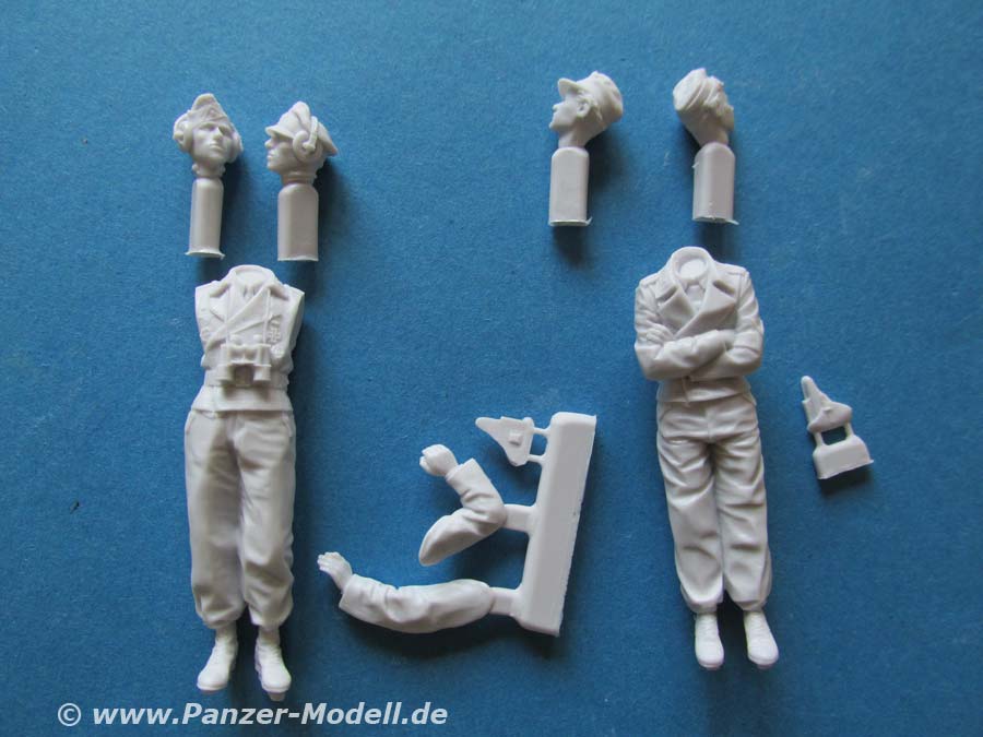 Beide Figuren sind ebenfalls einzeln unter den Nummern 35175 und 35176 erhältlich. Die Figuren setzen sich jeweils aus mehreren Teilen zusammen. Grundsätzlich ist der Körper in einem Stück gegossen an die beide Arme und der Kopf angeklebt werden müssen, wobei eine Figur den linken Arm bereits vor dem Körper mit angegossen hat. Die andere Figur hat die Arme sogar schon mit an den Körper angegossen, sodass nur noch der Kopf angeklebt werden muss. Wie von Alpine gewohnt, liegen für jede Figur zwei Köpfe zur Auswahl bei. Die Figur mit Fernglas hat dabei je einen Kopf mit Schiffchen und Schirmmütze und in beiden Fällen Kopfhörer aufgesetzt. Beid er anderen Figur bieten die Köpfe entweder Schiffchen oder Feldmütze. Die Darstellung der Gesichter ist sehr gut gelungen mit feinen Details. Auch der Rest der Figuren weist eine sehr schöne Gussqualität auf - der Faltenwurf der Kleidung ist sehr gut und realistisch. Auch kleinere Details wie Gürtel, Fernglas, Abzeichen sind unheimlich gut detailliert und fein gegossen. Von den Posen her sind beide Figuren in stehender Haltung, eine der beiden nach hinten angelehnt mit verschränkten Armen und die andere (in Luke) stehend mit aufgestützer Hand. Ein nettes Set zur Bereicherung einer Szene mit einem Panzer. Für rund 27 Euro bekommt man hier ein schönes und qualitativ hochwertiges Set.