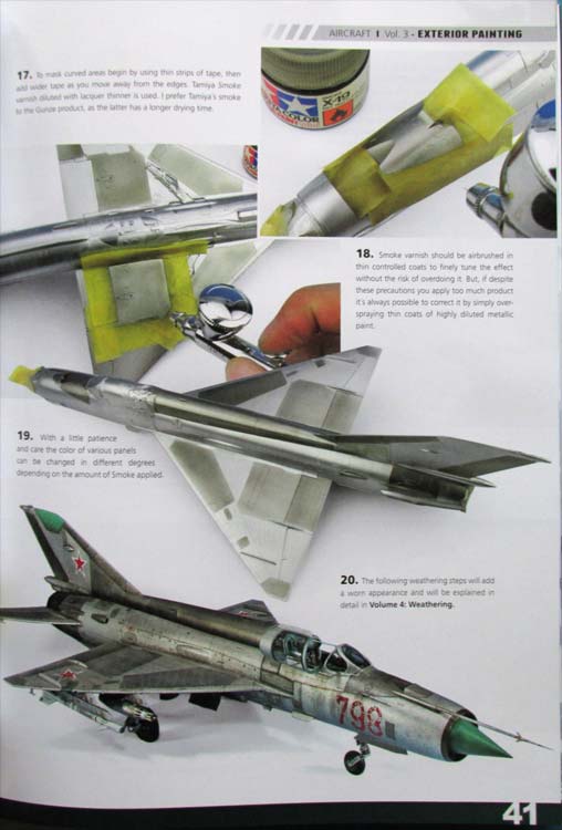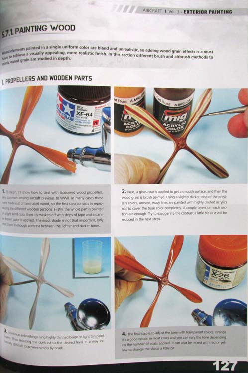Insgesamt lernt man in diesem Buch etwas über die Vorbereitung und Grundierung aller Arten von Oberflächen vor der Lackierung, Vorschattierung für die Betonung von Platten und Flächen, alle Arten von Tarnungen, darunter Grundlackierungen, einfarbige Tarnungen, abgenutzte Tarnungen und die komplexesten Mehrton-Tarnungen, Airbrush-Highlights und Fading, wie man Holzteile aller Art malt, Insignien, Ziffern und Schablonen nutzt und Schattierungen mit Tinte macht.