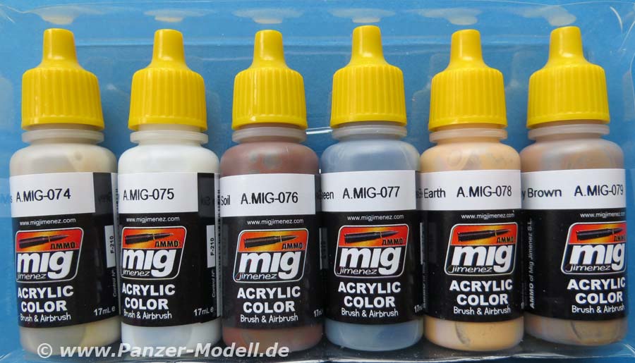 Mit der Art. Nr.7111 bietet Ammo of Mig nun ein Farbset für Panzer des 1.Weltkriegs sowohl Deutsche als auch Britische. Im Set enthalten sind 6 kleine Flaschen mit je 17ml Inhalt. Man beachte die neuen, gelben verschlusskappen, die signalisieren, dass diese schon die neue Ausführung der Flaschen mit enthaltener Stahlkugel sind - das macht das Aufschütteln der Farbe viel einfacher und effektiver. - A.MIG 0074 Green Moss Man hat hier drei Farbtöne für die deutschen Panzer mit den Farben 77 bis 79 und mit der Farbe 74 DEN Farbton für die englischen Panzer. Dazu die Farben 75, 76 und 78 für das englische Solomon Tarnmuster für fahrzeuge im Einsatz auf dem Kontinent. Das Farbset kostet 13,80 € und kann direkt bei Ammo of Mig bezogen werden. Special thanks to Mig Jimenez for the sample.
