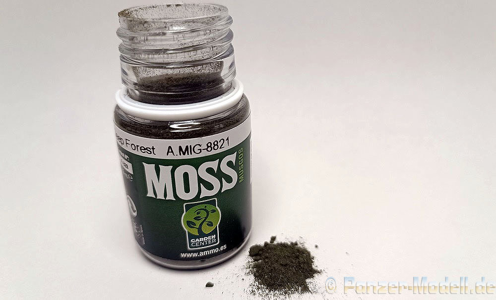 Mit der Artikelnummer A.MIG-8821 bietet der Hersteller Ammo by Mig ein Material für den Geländebau an. Unter der Bezeichnung Deep Forest Moss (Tiefer Wald Moos) erhalten wir die, bereits von Pigmenten und Washes bekannte, Plastikflasche mit 35ml Inhalt. Hierbei handelt es sich um ein feines, relativ hartes Granulat mit variierender Körnung in einem olivgrünen Farbton. Mit diesem Material lässt sich der Bewuchs von Moos und Flechten recht naturgetreu darstellen. Als Anwendungsbeispiele werden unter anderem Bäume, Gebäude und verlassene Fahrzeuge genannt. Ammo bietet dieses Produkt in verschiedenen Farbtönen an, alle Farbtöne sind auch untereinander mischbar. So lassen sich unterschiedliche Effekte erreichen. Grenzen für die Anwendung setzt hier nur die Phantasie des Modellbauers. Für die Verklebung mit dem Untergrund empfiehlt der Hersteller den hauseigenen Super Glue mit der Artikelnummer A.MIG-2031. Aber ich denke auch mit verdünntem Holzleim wird der Modellbauer sein Ziel erreichen. Ein, auch für Anfänger geeignetes, durchaus empfehlenswertes Produkt.