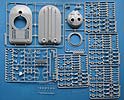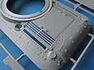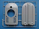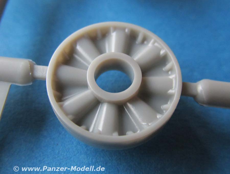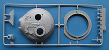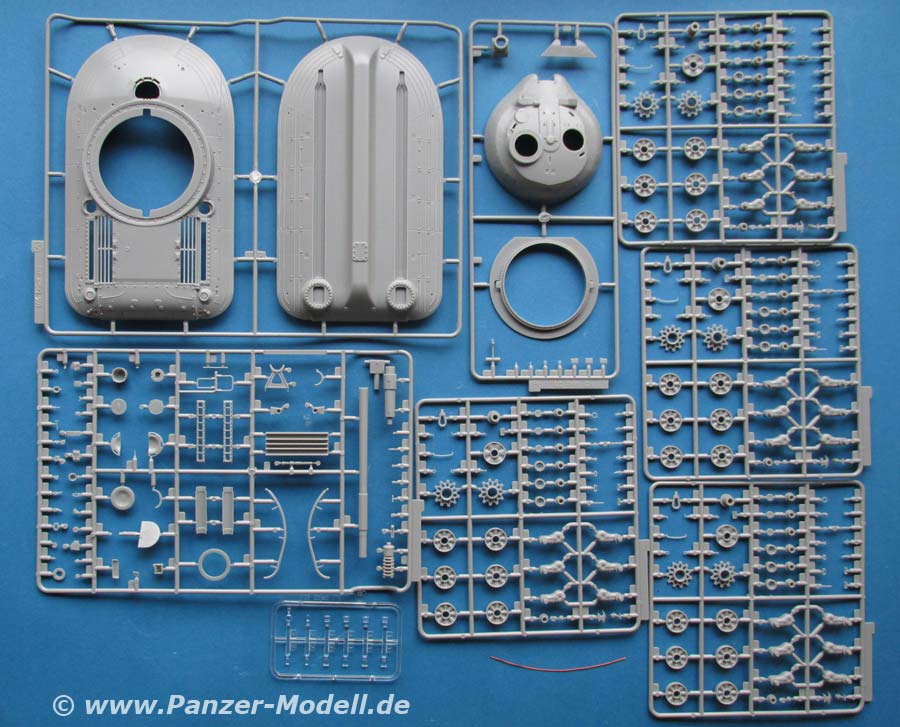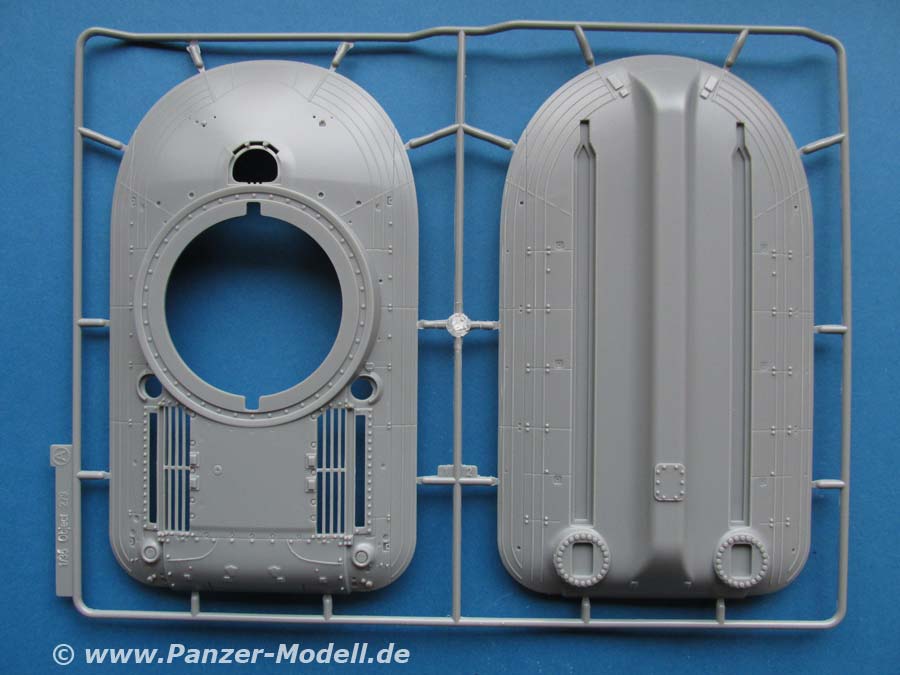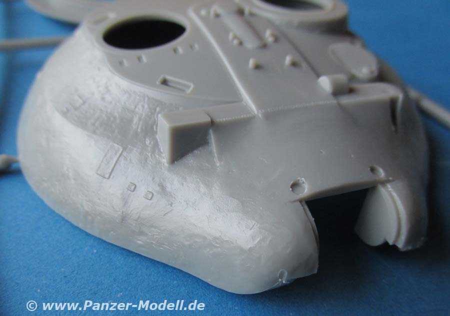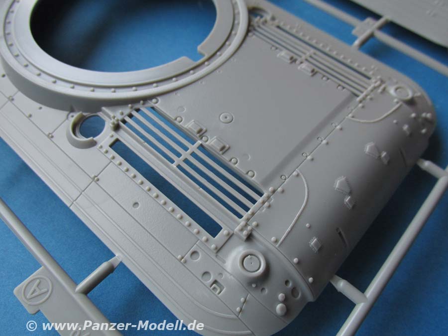Die Details an den Bauteilen, sind fein und sauber dargestellt, die Schweißnähte, z.B. an den Laufwerksträgern sind fein und sehr schön detailliert. Der Turm weist eine interessante und schöne grobe Gussstruktur auf, während die Wanne schön glatt nur nur mit den entsprechenden Prädedetails der umlaufenden Rippen versehen ist. Die Lüftergrätings auf dem Motordeck sind offen und werden durch fein geätzte PE Lüftergitter später verschlossen. Auch die Fahrerluke ist offen und kann somit ggf. eine Fahrerfigur eingebaut werden - leider liegt dem Bausatz keine bei.