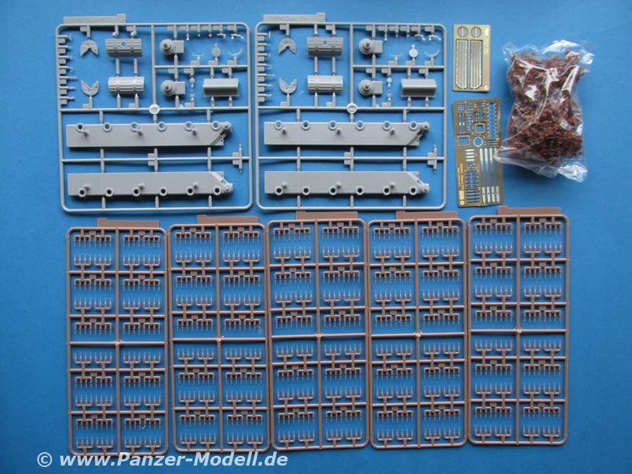 Im Karton finden wir 14 recht große Spritzlinge, ein Spritzling Klarsichtteile, PE Teile, Einzelgliedkette und Drahtmaterial.