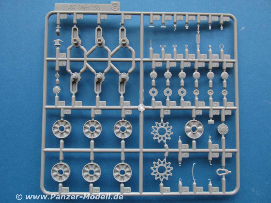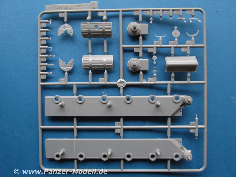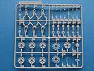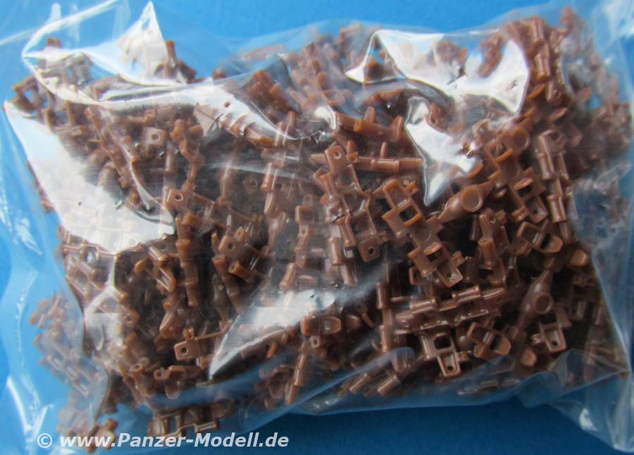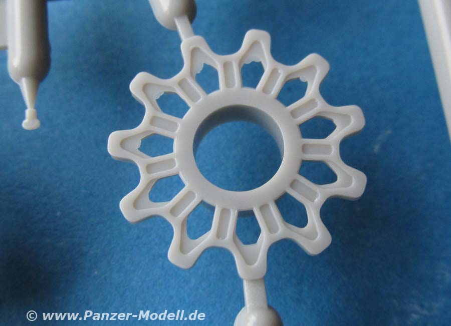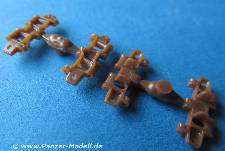 Was erfreulich ist, ist die Beigabe einer beweglichen Einzelgliedkette mit Bauhilfe - das macht einen exzellenten Eindruck mit den seitlich einzusteckenden Kettenbolzen und den Details der Kettenglieder. Vor allem dass die Kettenglieder nur an jeweils einem Anguss sitzen, macht die Arbeit wesentlich angenehmer. Einzig die Auswerferstellen auf jedem Kettenglied zwischen den beiden Führungszähnen sind etwas ärgerlich, andererseits an der Stelle am gebauten Modell nur an wenigen Stellen zu sehen.