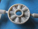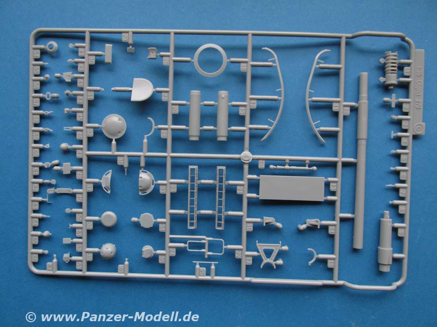 Für den Turm liegt ein Kanonenrohr aus Plastik bei, das sich zwar aus mehreren Teilen zusammensetzt, aber glücklicherweise nicht mehr aus längsgeteilten Halbteilen. Besonders erfreulich ist die gerippte Mündungsbremse, die einteilig gemacht lediglich mit einem Abschlussring komplettiert werden muss. Das Rohr kann in seiner Wiege höhenbeweglich eingebaut werden.