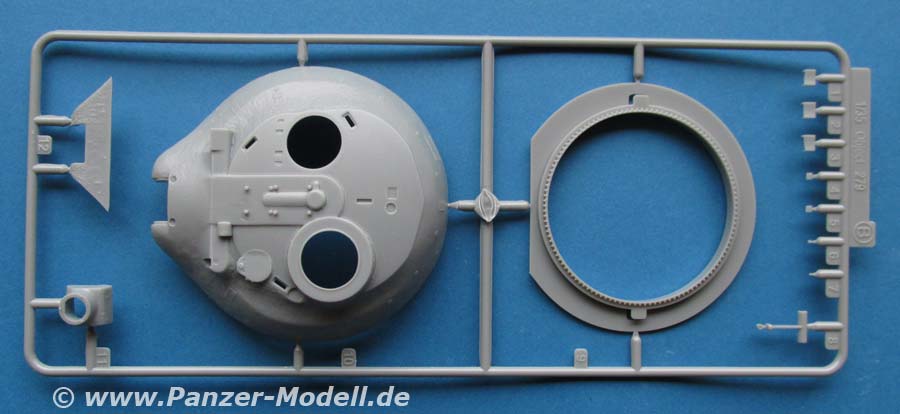 Die Kommandantenkuppel kann nicht nur offen oder geschlossen angebaut werden, auch die Beobachtungsoptik an der Kuppel kann beweglich angebaut werden. Weitere Details am Turm sind doch erstaunlich zahlreich und mitunter fast winzig in Plastik gemacht - beeindruckend aber auch herausfordernd diese sauber vom Spritzling zu trennen ohne dass sie gleich verlorengehen. Die gilt auch für die hauchfeinen Ösen an der Turmseiten die aus der PE Platine befreit werden müssen.