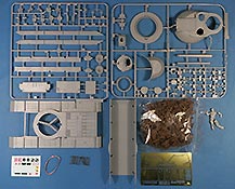 Im Karton finden wir 9 graue Spritzlinge, die Unterwanne, die Oberwanne, ein Beutel Einzelgliedketten, acht Metallfedern, eine Platine PE Teile, verdrilltes Kupferkabel und ein Decalbogen. Als Special liegt der Erstauflage der limitierten Serie eine Resinfigur aus 4 Teilen bei.