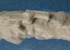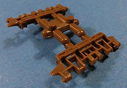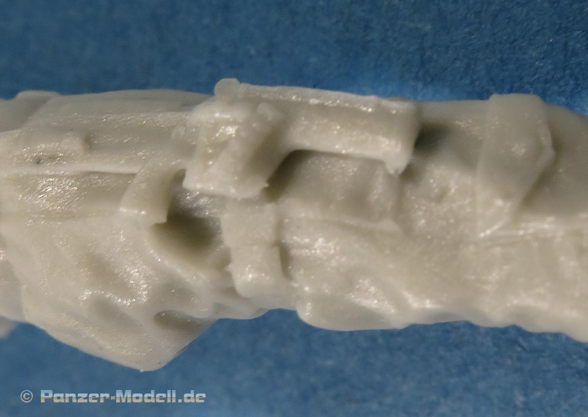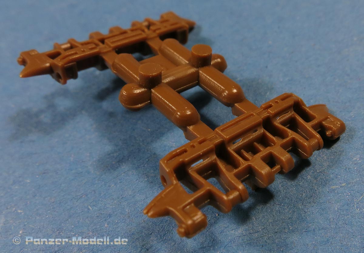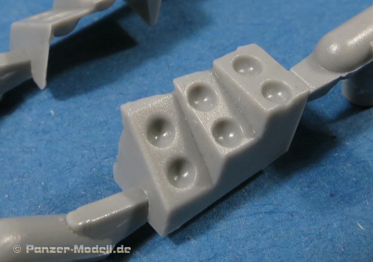Die Ketten liegen als Einzelglieder vor, die im Zweierpack an einem Anspritzling angegeossen sind. Die Ketten sollen beweglich gebaut werden können und lassen sich einfach zusammenklicken - also nicht mehr das aufwändige Verbundsystem wie in der ersten Produktionsserie der Conquerorbausätze. Dies ist ein großer Serviceschritt. Ebenfalls höchst erfreulich, dass die Ketten sauber und detailliert gespritzt sind und frei von Auswerferstellen sind.