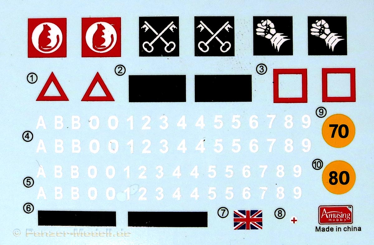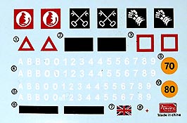 Es liegt ein Decalbogen mit verschiedenen Markierungen bei, und es sind je zwei Sets Nummern und Buchstaben vorhanden um Wunschkennzeichen zusammenzustellen. Dazu MLC Schilder 70 und 80 und der obligatorische Union Jack.