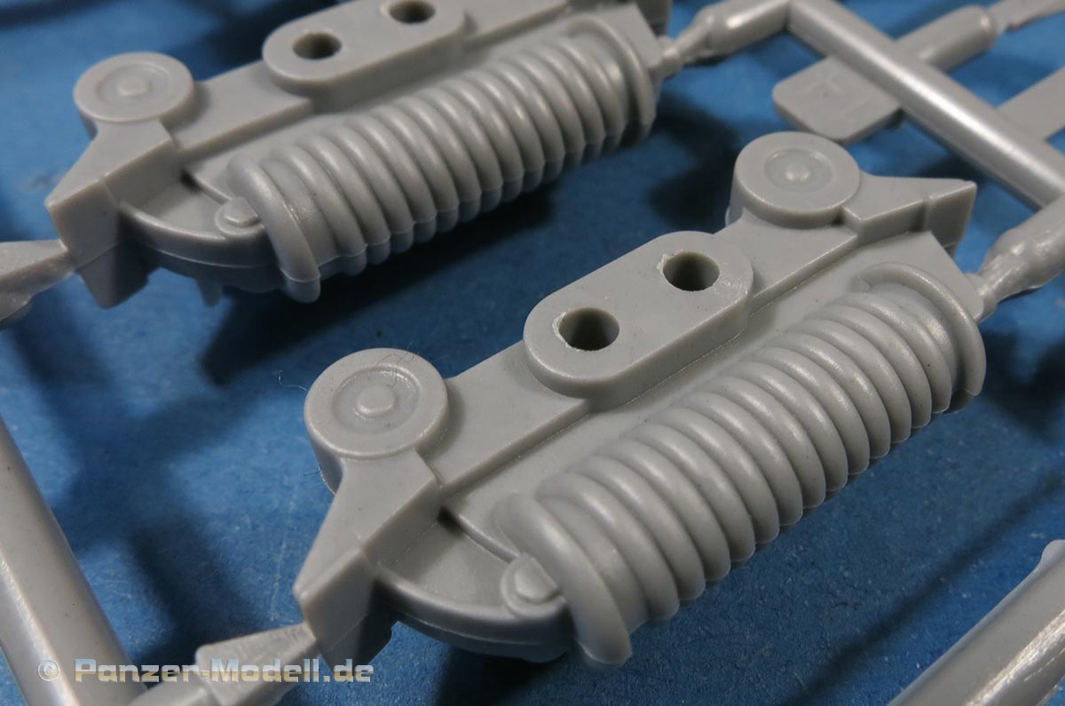 Die Laufwerksfederungselemente setzen sich aus wenigen Teilen zusammen und werden mit einer funktionierenden Metallfeder versehen, sodass die Elemente tatsächlich einfedern können. Dem Bausatz liegen ebendiese Federungsgelemente aber auch zusätzlich als ganze Teile mit festen Federn aus Plastik bei - kann also jeder nach Wunsch das ganze starr oder beweglich bauen.