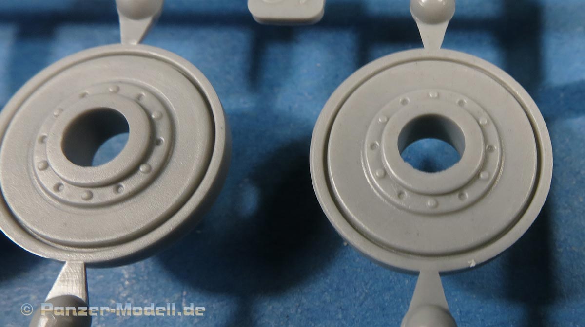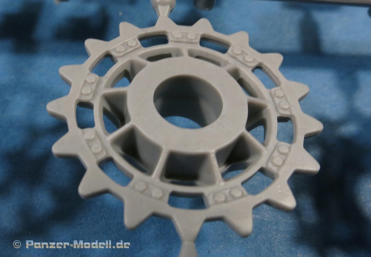 Die Laufrollen machen einen guten Eindruck mit zwar wenigen, aber guten Details. Auch die Leit- und ganz besonders die Treibräder mit den Rippen und durchbrochenem Zahnkranz machen einen sehr guten Eindruck.