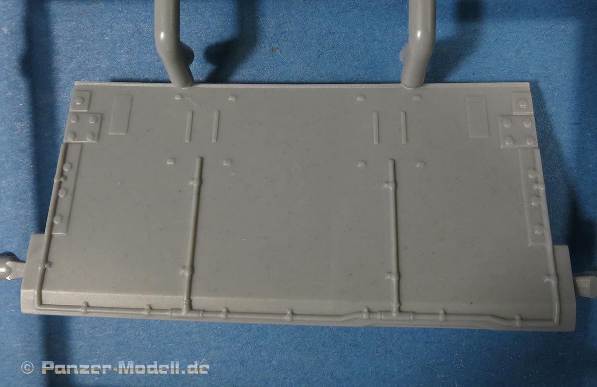 Die Oberwanne besteht auch im Groben aus einem großen Einzelteil, in das vorn die Bug- und die Fahrerabdeckplatte eingesetzt werden - diese haben tolle Details mit der feienn Darstellung z.B. einer Gussnummer. Diese Oberwanne zeigt jedenfalls alle korrekten Details einer Mk.I wie die drei Winkelspiegel für den Fahrer oder den nach aussen versetzte Tankstutzen am Motordeck hinten und nicht in den Motorluken wie bei der Mk.II (die Dragon auch prompt vergessen hatte). Sehr schön und insbesondere korrekt sind die Lüfteröffnungen in allen Motorklappen dargestellt mit der richtigen Anzahl bzw. entsprechend feinen Darstellung der Lamellen.