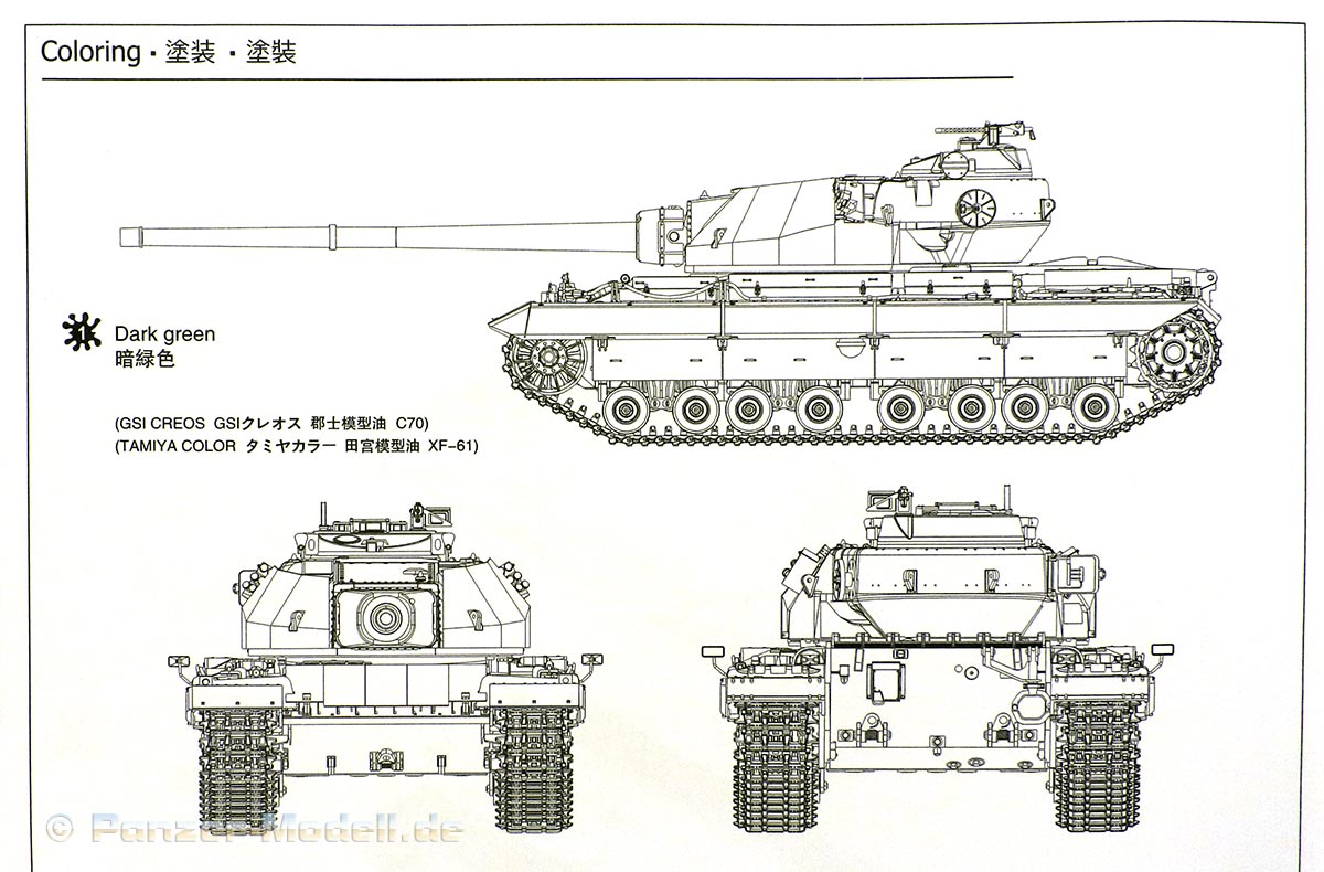 Auf der letzten Seite wird in einer Dreiseitenansicht das Fahrzeug in schwarzweiß gezeigt, das eine einfarbige Lackierung in dunkelgrün zeigt, weitere Markierungen werden nicht gezeigt.