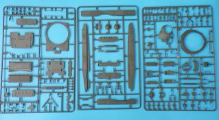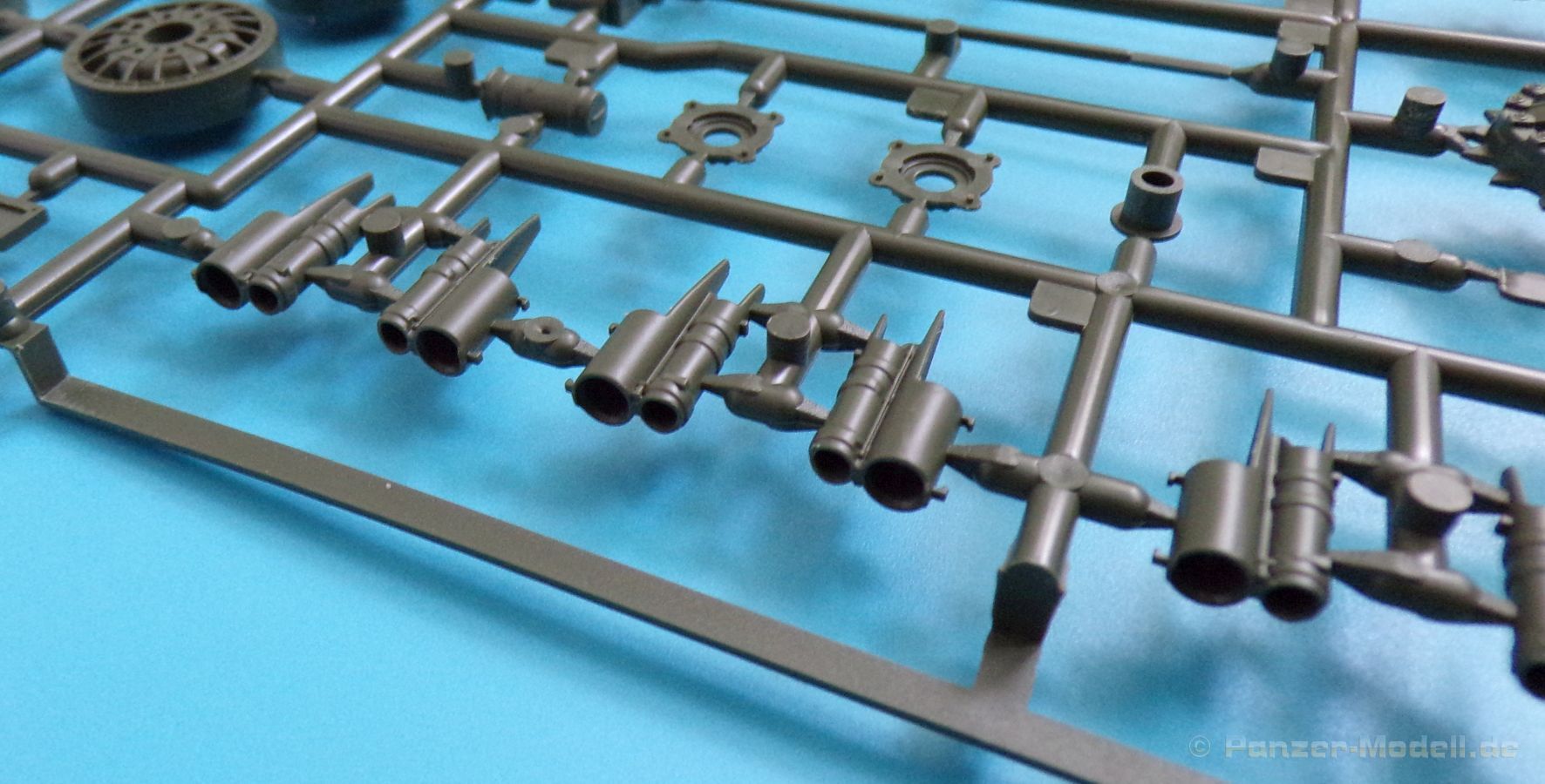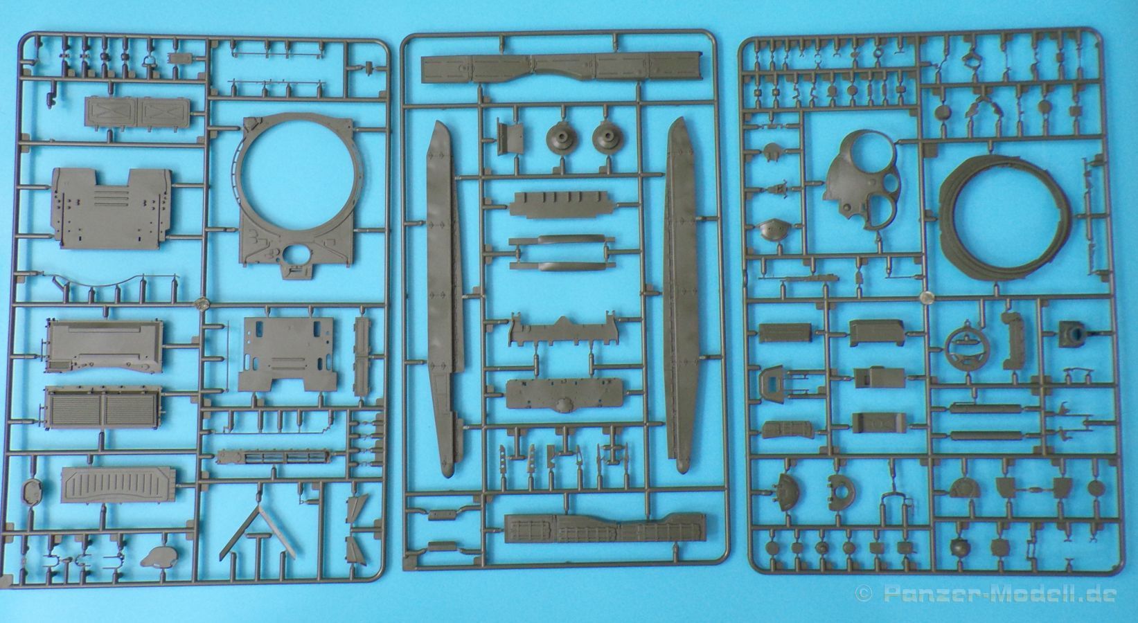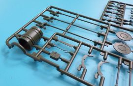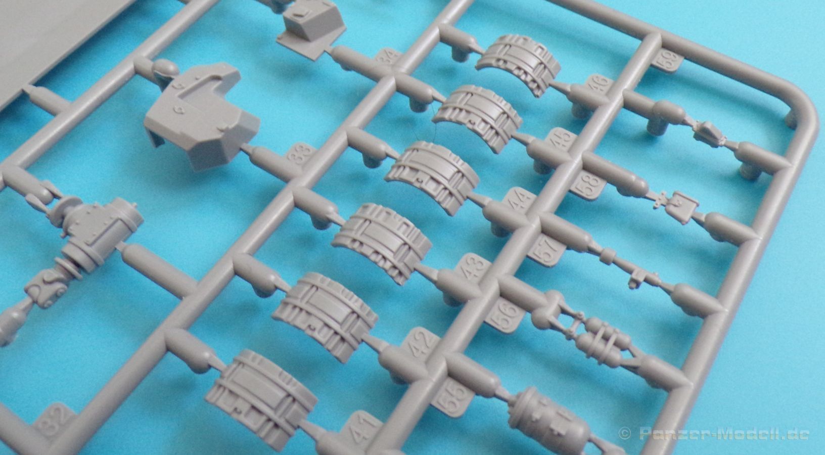 Beim Fahrwerk werden die Drehstäbe (mit den angegossenen Schwingarmen) in die hervorragend wiedergegeben Unterwanne geklebt, und bleiben beweglich. Dadurch kann das Modell auch an unebene Untergründe angepasst werden, und macht in jedem Diorama eine gute Figur. Auch die Triebräder, Leiträder Lauf- und Stützrollen sind sehr schön wiedergegeben und setzen sich erfreulicherweise aus nur wenigen Teilen zusammen, ohne hier an der Detaillierung zu sparen.
