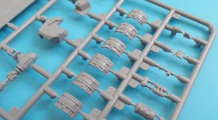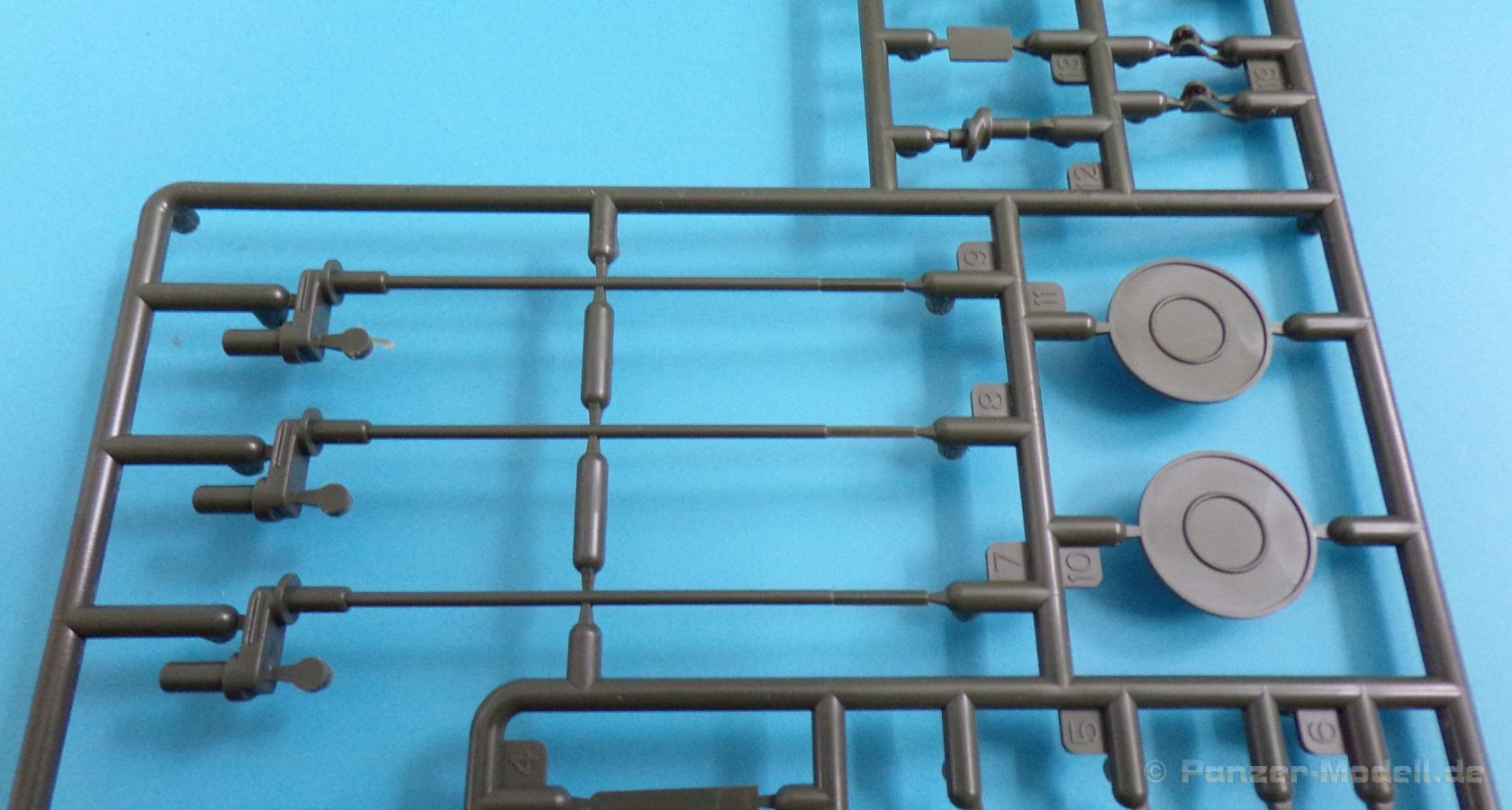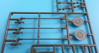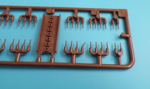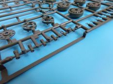 Die Kettenbolzen befinden sich an sieben eigenen Gussästen. Diese können zu Gruppen aus je zwei Bolzen bzw. vier Bolzen ausgeschnitten werden und mit Hilfe einer Montagehilfe, in welche die einzelnen Kettenglieder eingelegt werden, in die Bohrungen der einzelnen Glieder (ohne zu kleben) eingeführt werden. Dies ist sehr effektiv und die Kette bleibt beweglich. Ein recht einfaches System, jedoch ist sauberes Arbeiten hier Pflicht. Für jede Seite werden Fünfundneunzig Kettenglieder benötigt, die Kettenglieder befinden sich an Achtundzwanzig kleinen Strängen zu je 8 Gliedern, die einzeln ausgeschnitten und versäubert werden müssen.