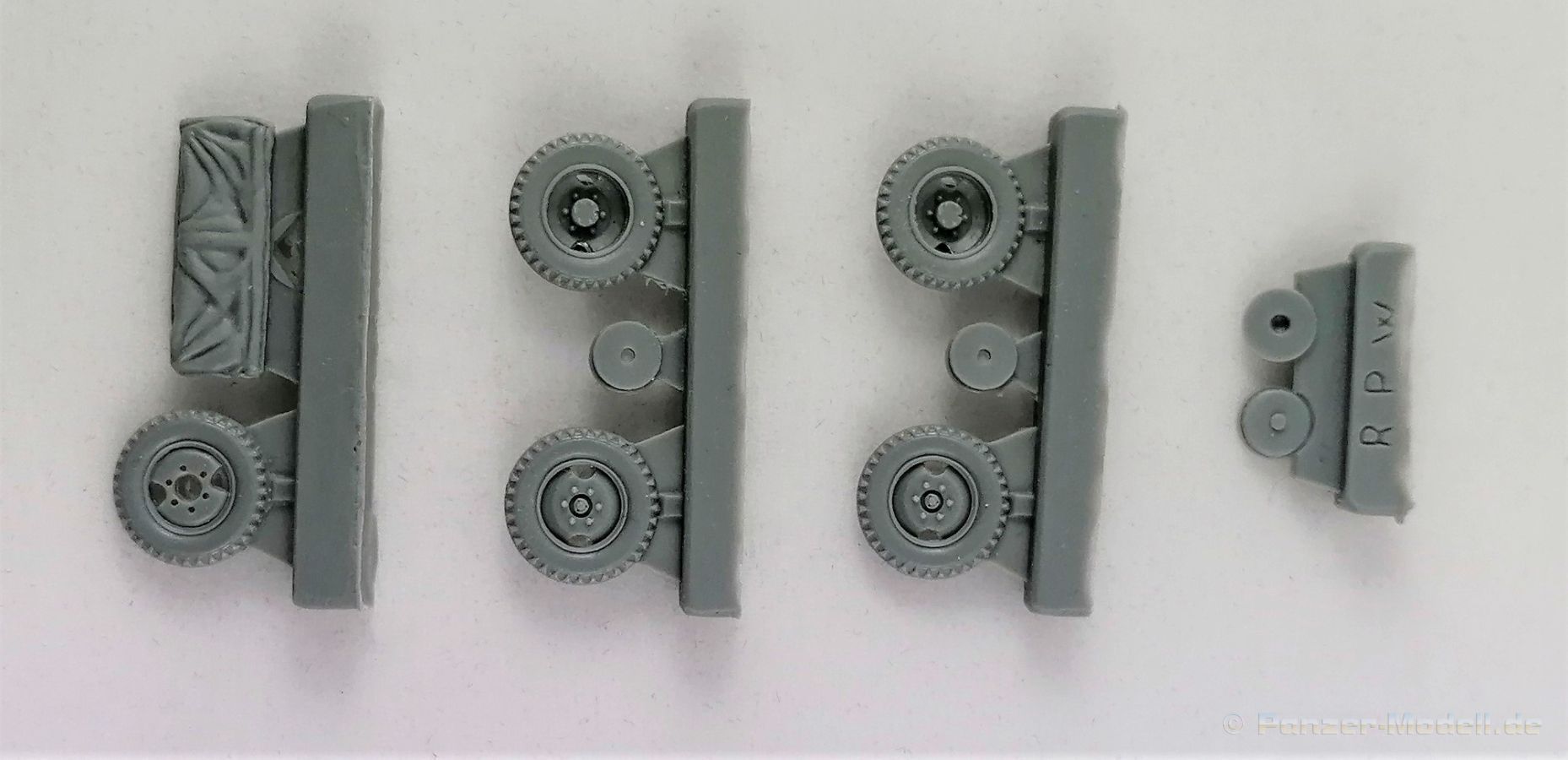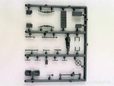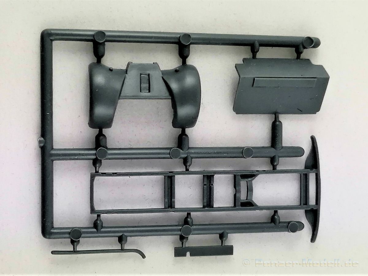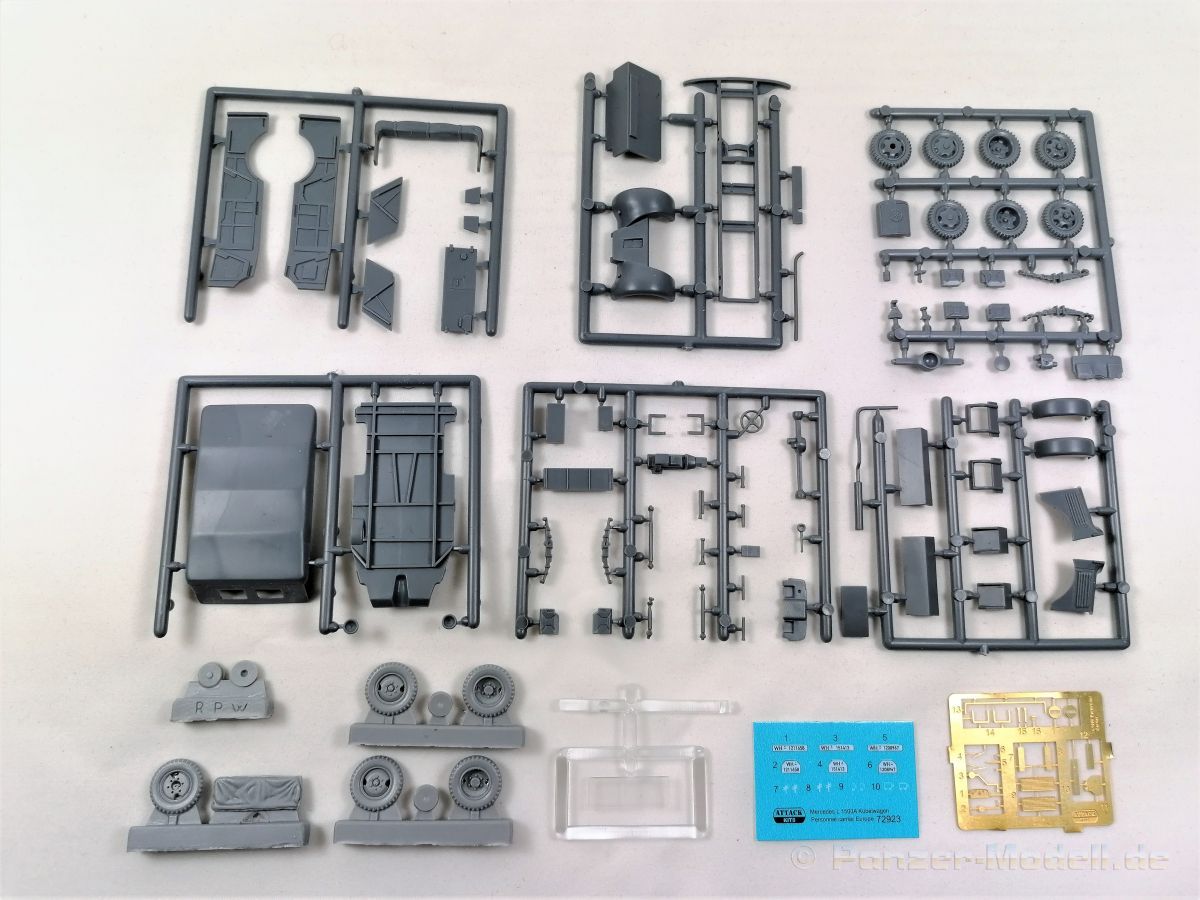 Doch werfen wir erstmal einen Blick in den stabilen, sehr geräumigen Stülpkarton. Dieser beherbergt sechs Rahmen aus grauem Plastik, vier Stege mit Resinteilen, ein Klarsichtteil und eine kleine PE-Platine. Abgerundet alles durch einen Decalbogen. Alle Teile machen auf den ersten Blick einen sehr guten Eindruck. Auswerfermarkierungen, Fahnen oder Fischhäute sind nicht zu entdecken. Somit dürfte sich die Versäuberung in engen Grenzen halten. Die Detaillierung der Bauteile ist als durchweg gut zu bezeichnen. Toll ausgeführte Kühlrippen, schön ausgearbeitete Details auch in und an der Karosserie. Highlight sicher auch der Mercedes-Stern auf dem Kühler. Sehr schön gestaltete Sitze und auch für diese Größe sehr gut umgesetzte Kleinteile wie Peilstangen, Kardanwellen, Achsen und mehr. Wahlweise kann das Fahrzeug mit offenem oder geschlossenen Verdeck gebaut werden. Etwas ärgerlich ist die Tatsache das auf den Spritzlingen keine Bauteilenummer sind. Die Nummern sind nur auf der Bauteileübersicht ersichtlich. Bei der relativ geringen Teileanzahl ist das noch einigermaßen gut zu bewerkstelligen. Damit wenden wir uns den Resinteilen zu. Absolut sauber, ohne Naht oder Fischhaut, mit einem tollen Profil versehen ersetzen sie die Plastikräder des Kits. Das gilt auch für das Ersatzrad. Zudem ist hier auch eine abgeplante Windschutzscheibe zu finden. Ein guter Ersatz für das Klarteil das meiner Meinung doch etzwas zu dick ist. Damit ist das Kfz aber nur offen zu bauen. Oder man baut die Frontscheibe mit Profilen neu auf. Kommen wir noch auf die PEs zu sprechen. Diese sind sehr filigran und ersetzen viele der doch etwas prominent ausgefallenen Bausatzteile. Es finden sich Nummernschilder, geriffelte Trittflächen, Peilstangen, Handläufe, Richtungsanzeiger, Scheibenwischer und noch weitere Teile um das Modell zu verfeinern. Vor allem ist auch das geätzte Armaturenbrett hervorzuheben. Der Decalbogen weist feine Kenn- und Einheitszeichen auf, ausreichend für die drei Bemalungsvorschläge. Das sind