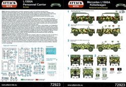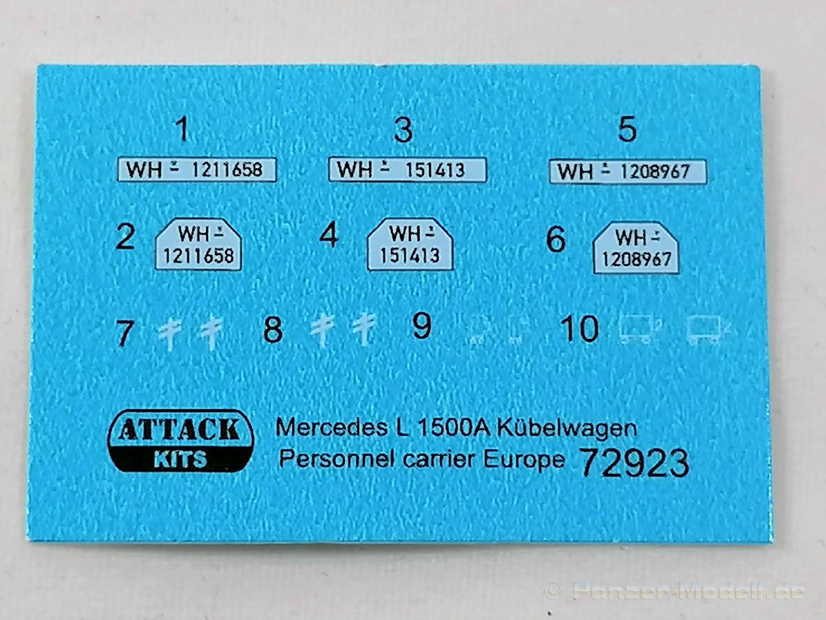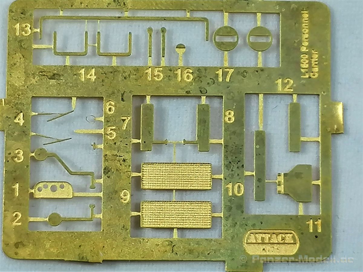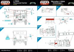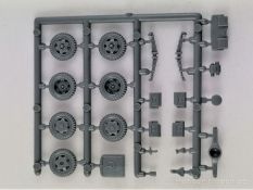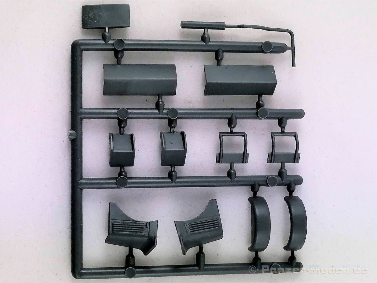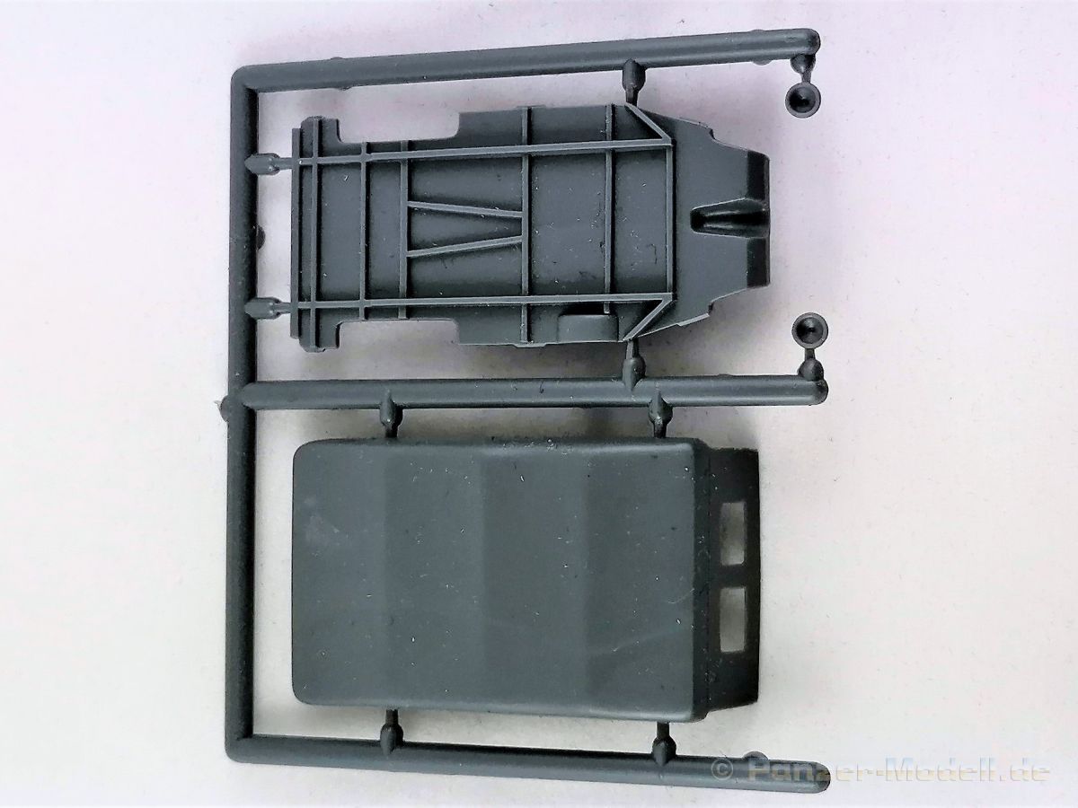 Doch werfen wir erstmal einen Blick in den stabilen, sehr geräumigen Stülpkarton. Dieser beherbergt sechs Rahmen aus grauem Plastik, vier Stege mit Resinteilen, ein Klarsichtteil und eine kleine PE-Platine. Abgerundet alles durch einen Decalbogen. Alle Teile machen auf den ersten Blick einen sehr guten Eindruck. Auswerfermarkierungen, Fahnen oder Fischhäute sind nicht zu entdecken. Somit dürfte sich die Versäuberung in engen Grenzen halten. Die Detaillierung der Bauteile ist als durchweg gut zu bezeichnen. Toll ausgeführte Kühlrippen, schön ausgearbeitete Details auch in und an der Karosserie. Highlight sicher auch der Mercedes-Stern auf dem Kühler. Sehr schön gestaltete Sitze und auch für diese Größe sehr gut umgesetzte Kleinteile wie Peilstangen, Kardanwellen, Achsen und mehr. Wahlweise kann das Fahrzeug mit offenem oder geschlossenen Verdeck gebaut werden. Etwas ärgerlich ist die Tatsache das auf den Spritzlingen keine Bauteilenummer sind. Die Nummern sind nur auf der Bauteileübersicht ersichtlich. Bei der relativ geringen Teileanzahl ist das noch einigermaßen gut zu bewerkstelligen. Damit wenden wir uns den Resinteilen zu. Absolut sauber, ohne Naht oder Fischhaut, mit einem tollen Profil versehen ersetzen sie die Plastikräder des Kits. Das gilt auch für das Ersatzrad. Zudem ist hier auch eine abgeplante Windschutzscheibe zu finden. Ein guter Ersatz für das Klarteil das meiner Meinung doch etzwas zu dick ist. Damit ist das Kfz aber nur offen zu bauen. Oder man baut die Frontscheibe mit Profilen neu auf. Kommen wir noch auf die PEs zu sprechen. Diese sind sehr filigran und ersetzen viele der doch etwas prominent ausgefallenen Bausatzteile. Es finden sich Nummernschilder, geriffelte Trittflächen, Peilstangen, Handläufe, Richtungsanzeiger, Scheibenwischer und noch weitere Teile um das Modell zu verfeinern. Vor allem ist auch das geätzte Armaturenbrett hervorzuheben. Der Decalbogen weist feine Kenn- und Einheitszeichen auf, ausreichend für die drei Bemalungsvorschläge. Das sind
