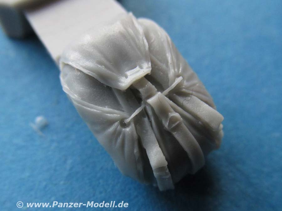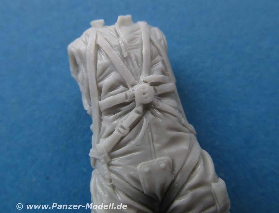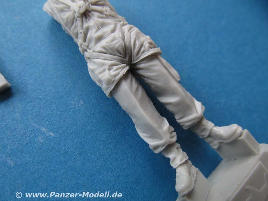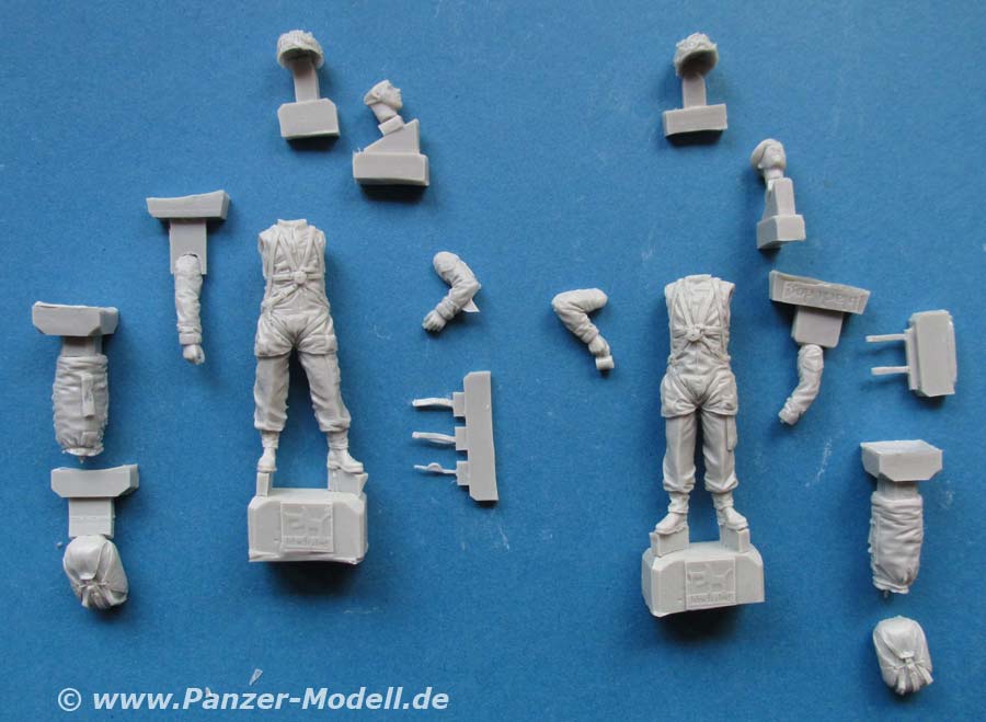 Jede Figur ist mit Rumpf und Beinen bereits komplett in einem Stück gegossen. Daran werden jeweils die Arme, der Kopf und ein paar Kleinteile angeklebt. Dazu gibt es pro Figur einen Fallschirm- und einen Seesack.