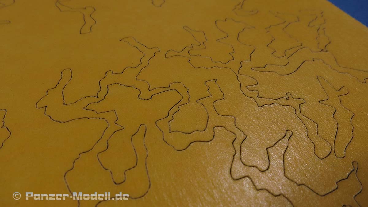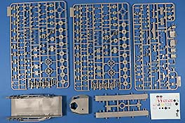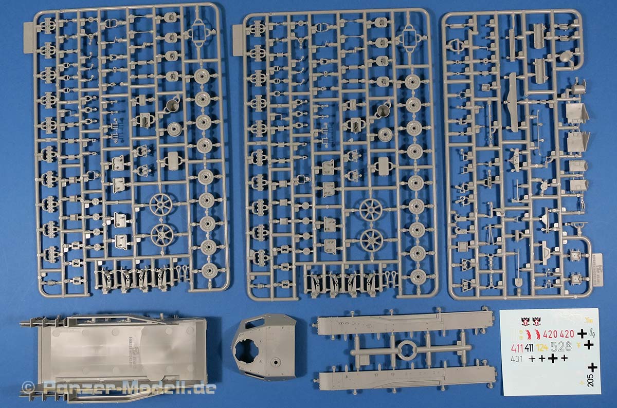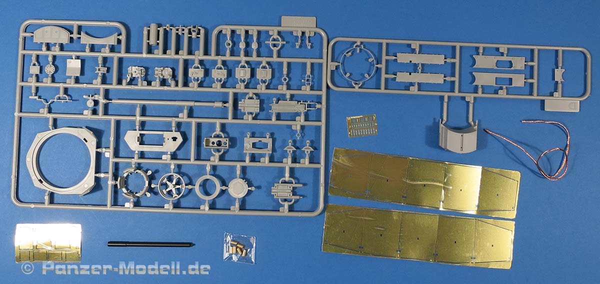 Im Bausatzkarton finden wir 10 graue Spritzlinge, die Unterwanne, das Turmoberteil, vier PE Platinen, ein Metallrohr, verdrilltes Kupferseil, Metall Nebelwurfbecher und ein Decalbogen. In einer Sonderserie liegt dem Bausatz auch ein DIN A4 Bogen mit Spritzschablonen für ein Tarnmuster mit bei.