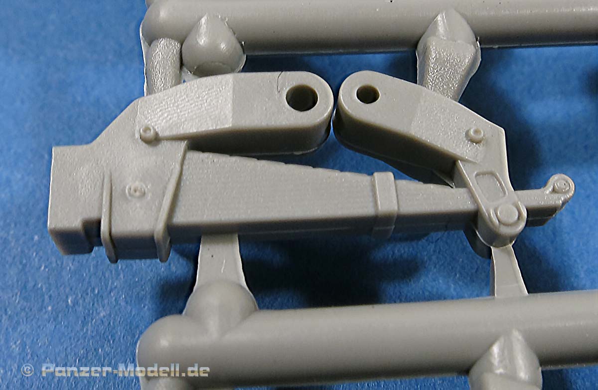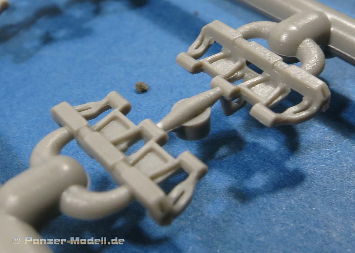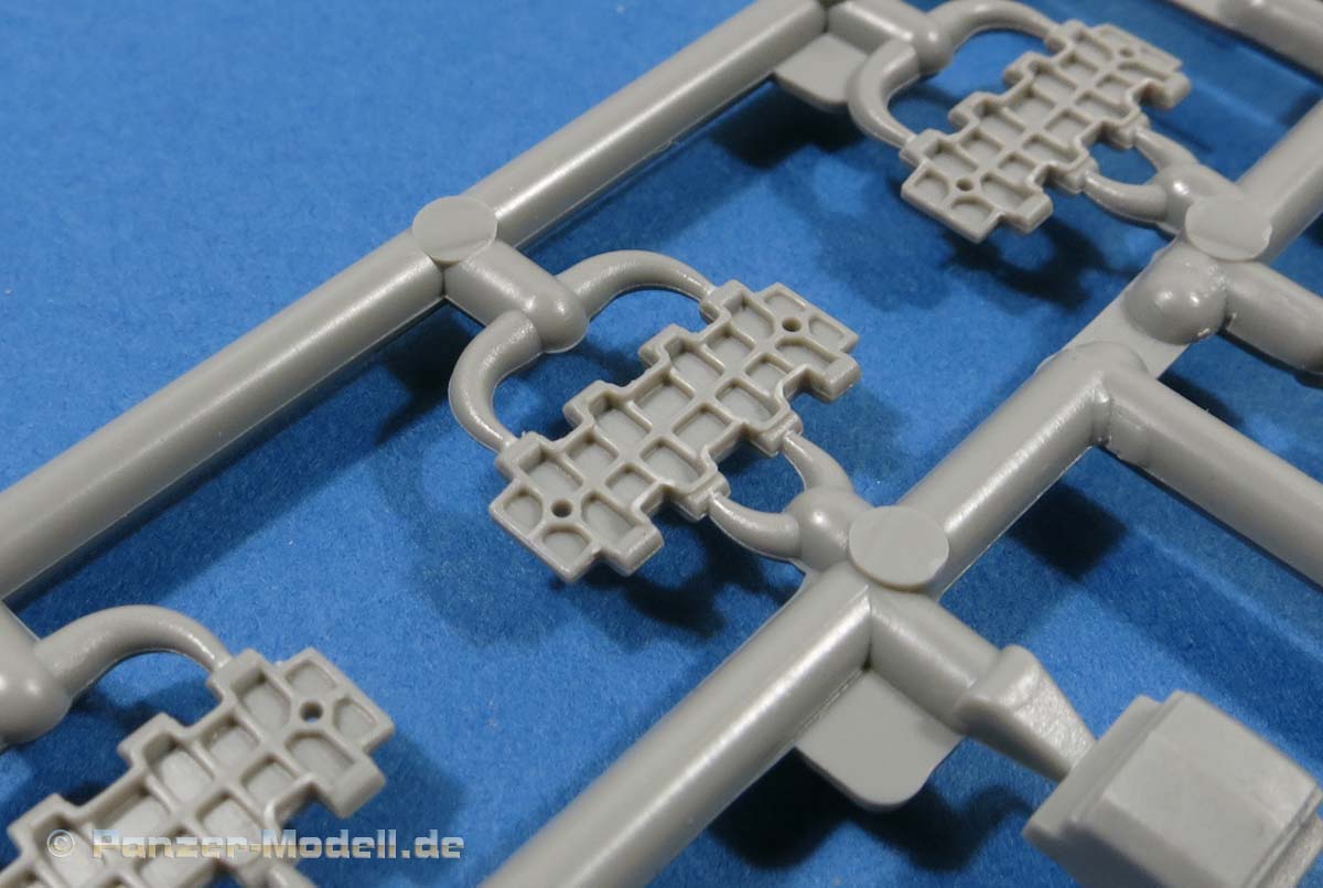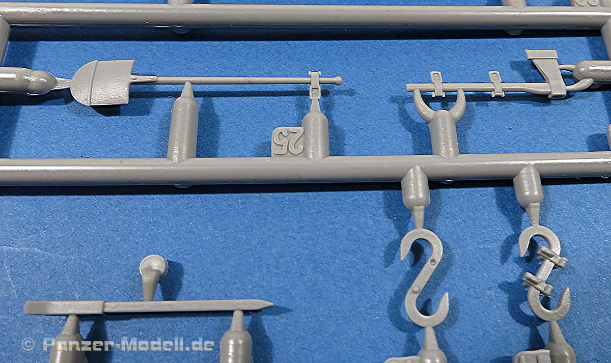 Die Kettenbleche liegen je einteilig bei und gefallen mit schönen Details wie dem Riffelblechmuster und den Markierungen für das werkzeug. Apropos Werkzeug - dies ist recht fein gespritzt. Selbst die angegossenen Halterungen wissen zu gefallen. Dennoch liegen für den, der es braucht, einzelne fein geätzte PE Halterungen bei.