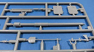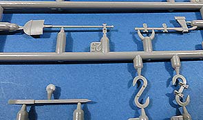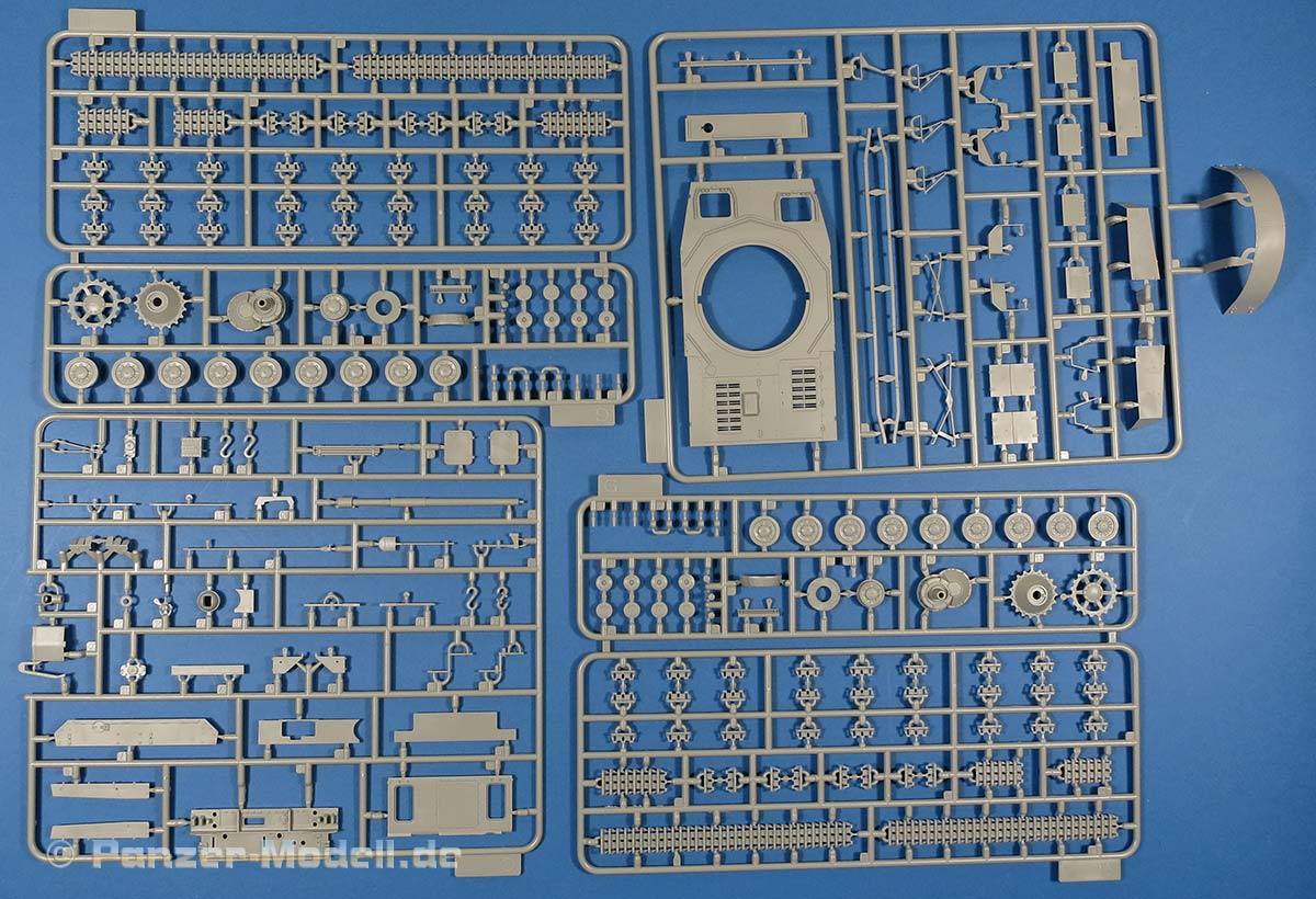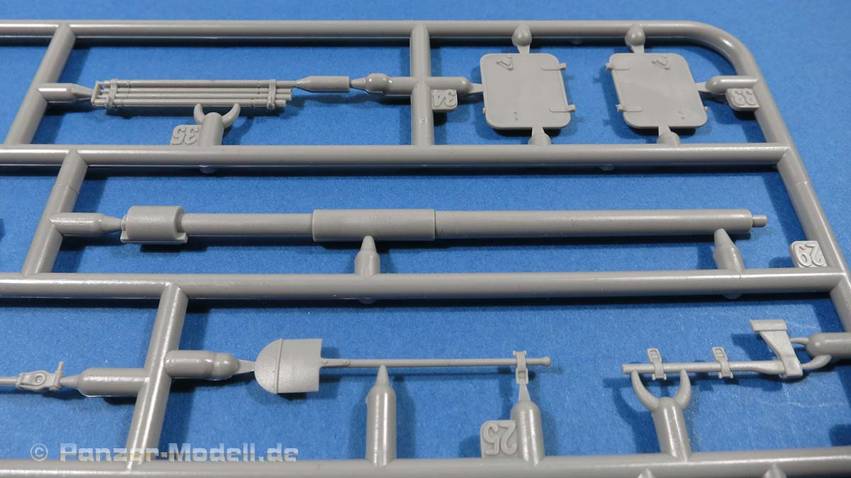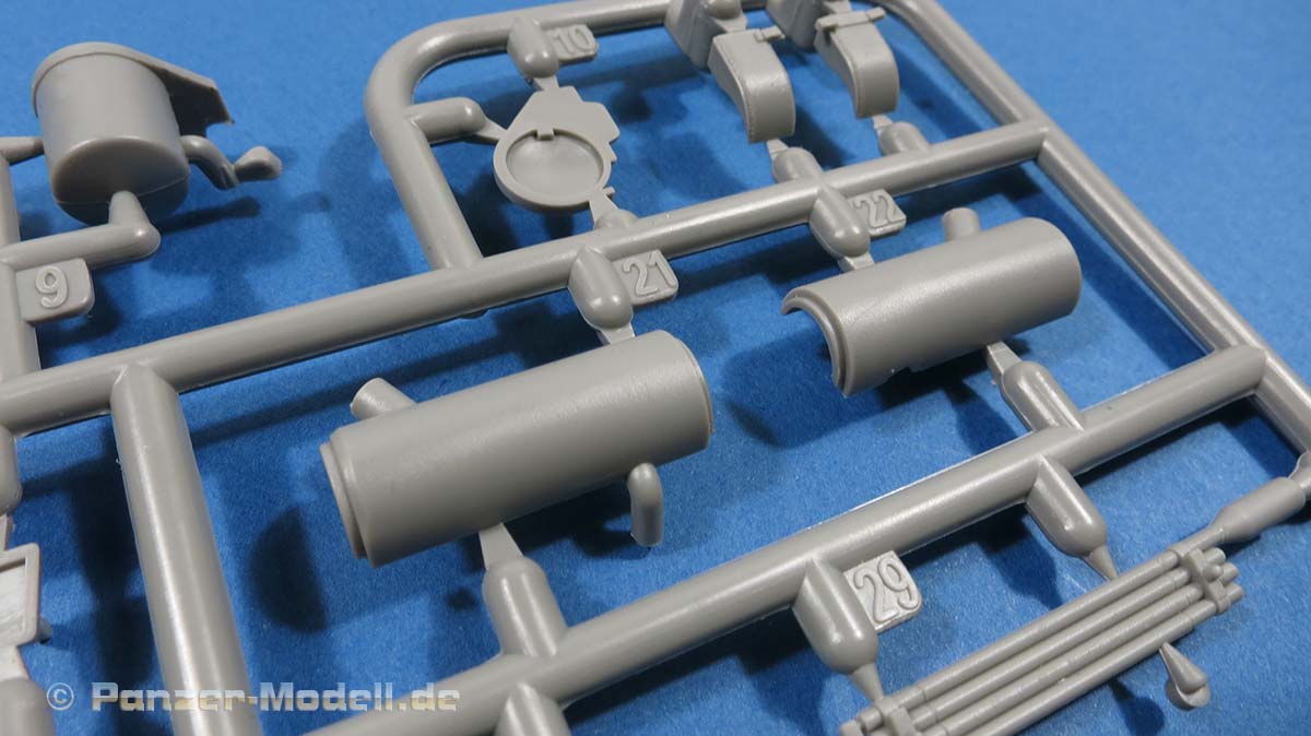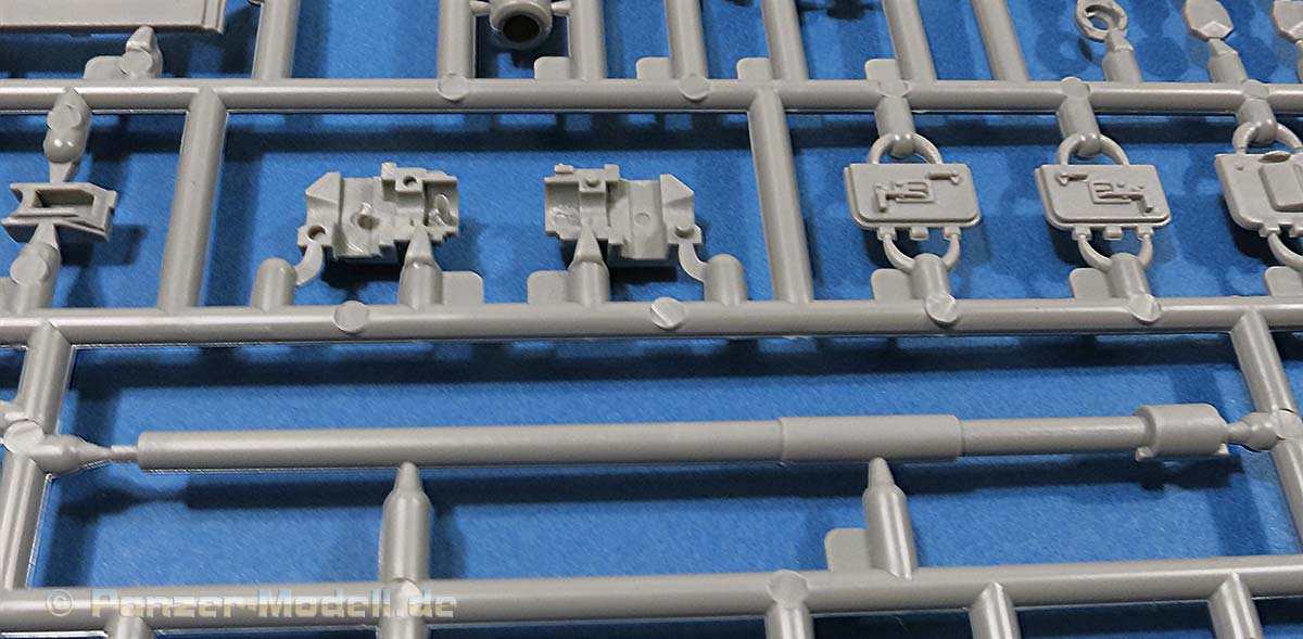 Die Kettenbleche liegen je einteilig bei und gefallen mit schönen Details wie dem Riffelblechmuster und den Markierungen für das werkzeug. Apropos Werkzeug - dies ist recht fein gespritzt. Selbst die angegossenen Halterungen wissen zu gefallen. Dennoch liegen für den, der es braucht, einzelne fein geätzte PE Halterungen bei.