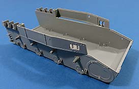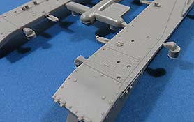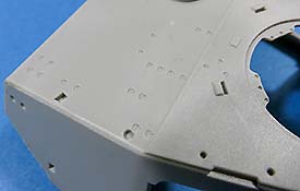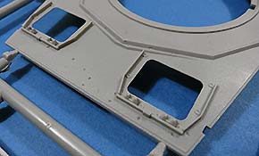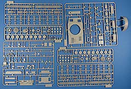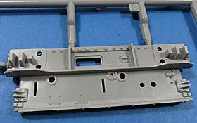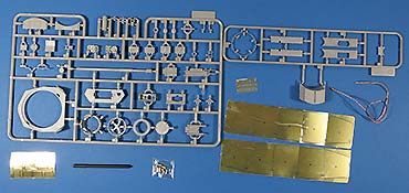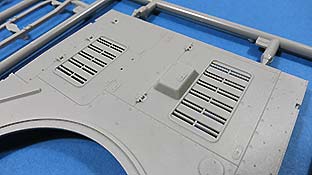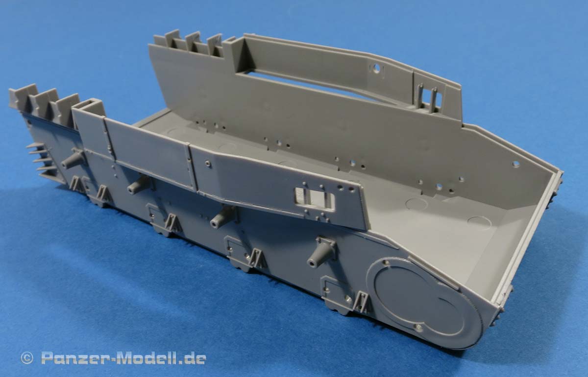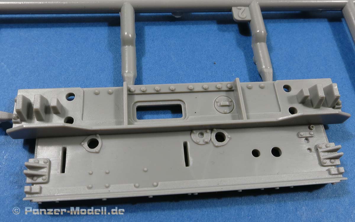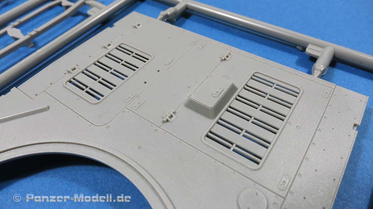 Schauen wir mal etwas genauer hin ... Die Unterwanne ist einteilig und dazu Teile des Aufbaus bereits mit angespritzt - das ist neu und vereinfacht den Bau sogar noch weiter. Die Details der Wanne mit den Nieten und weiteren Oberflächendetails sind sehr gut dargestellt. Für einige Optionsteile wie z.B. die Verschlussklappen der Motorlüftung liegen feine PE Teile oder normale Plastikteile bei.