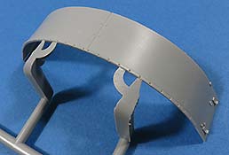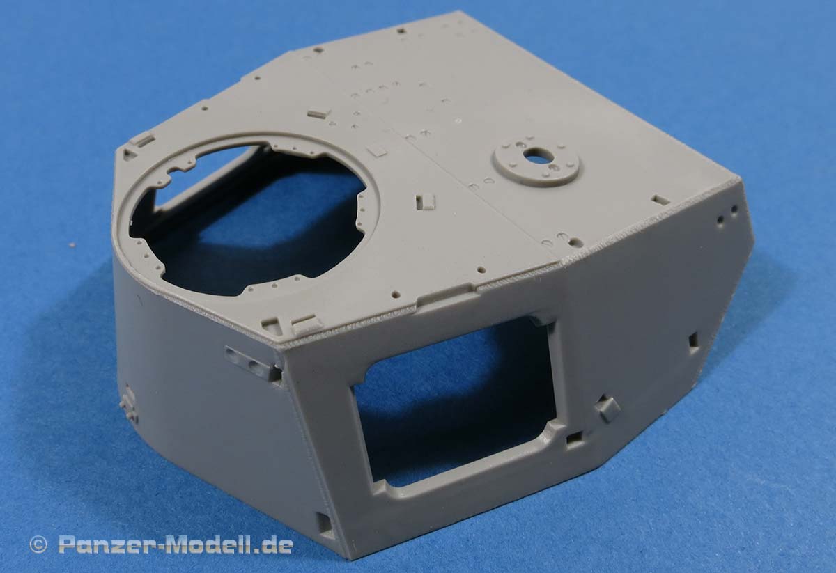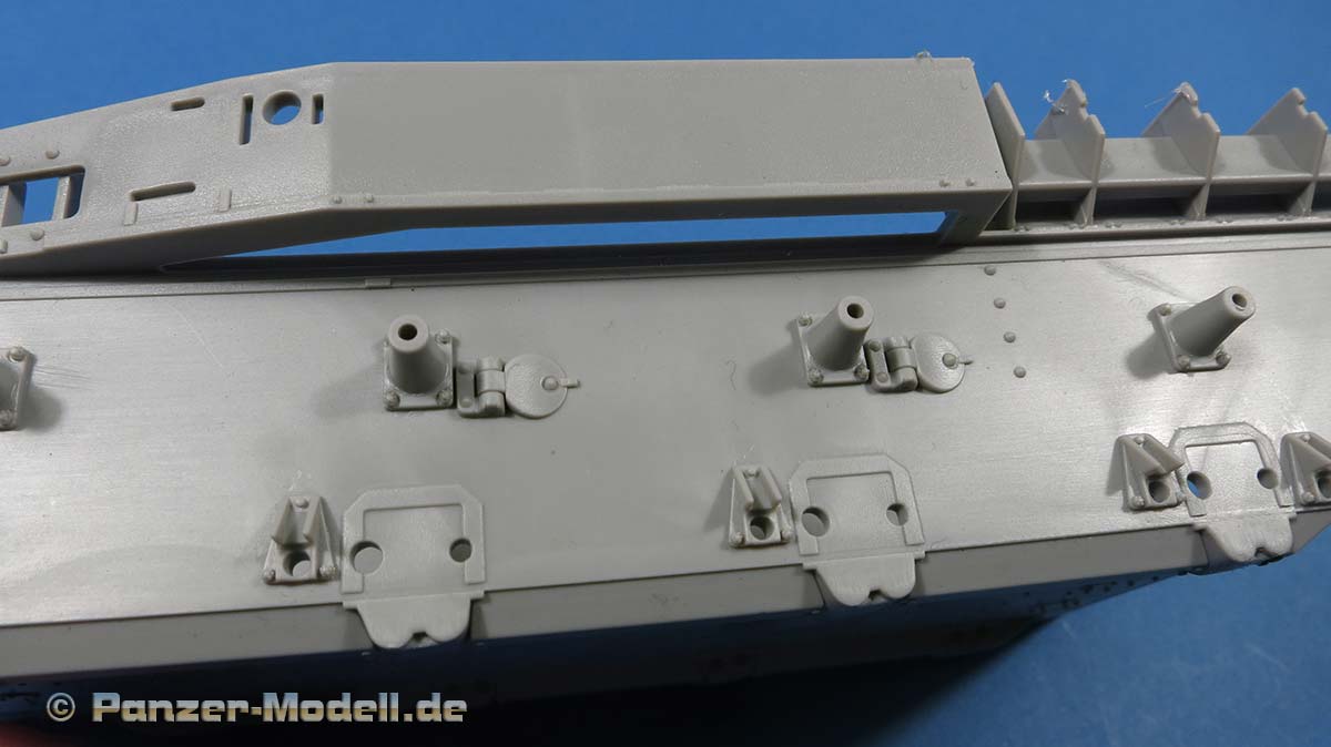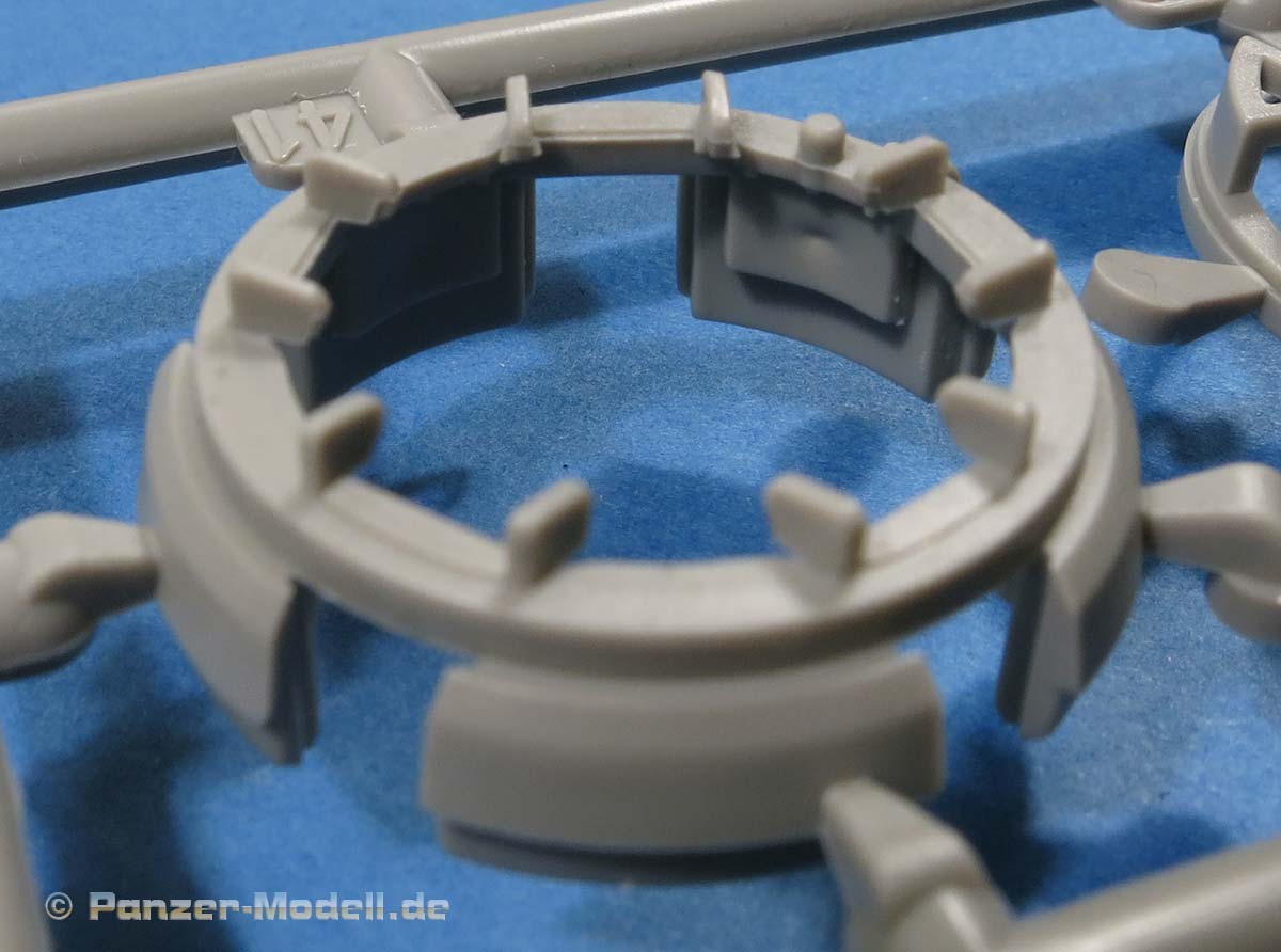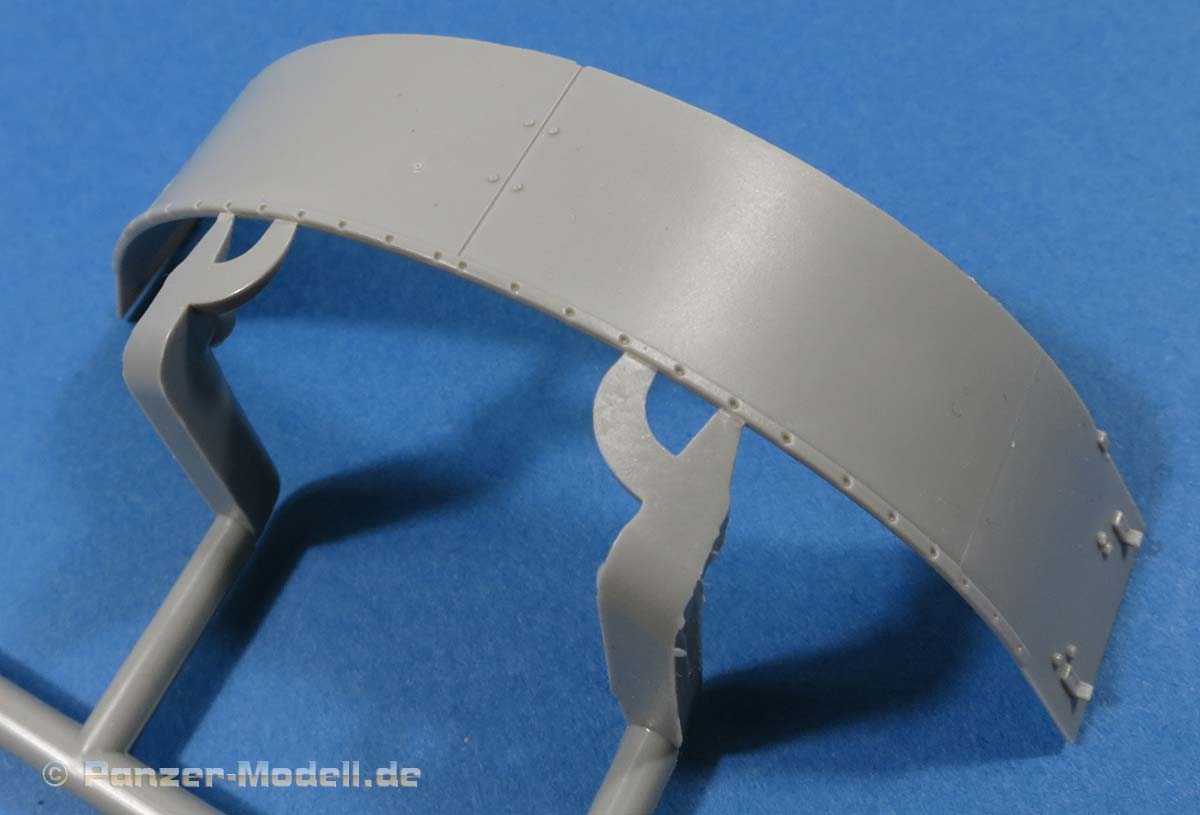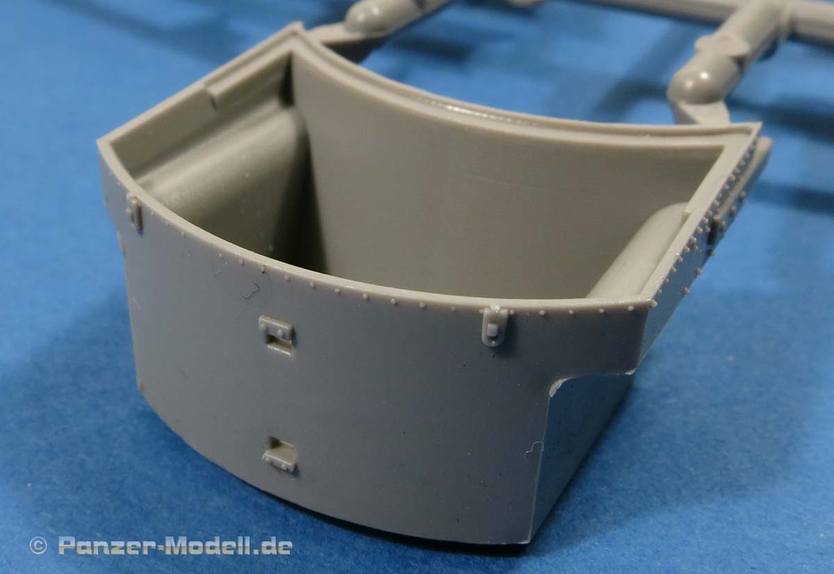 Die Turmschürzen sind aus Plastik gespritzt - das ist von der Materialstärke her natürlich nicht so schön, wie PE Blech, aber angesichts der Oberflächendetails mit Nieten und Scharnieren und der sauberen Biegung am Heck ist diese Version für die Baubarkeit die beste Möglichkeit.