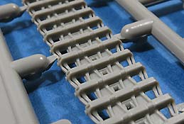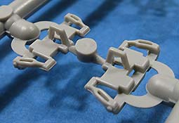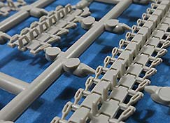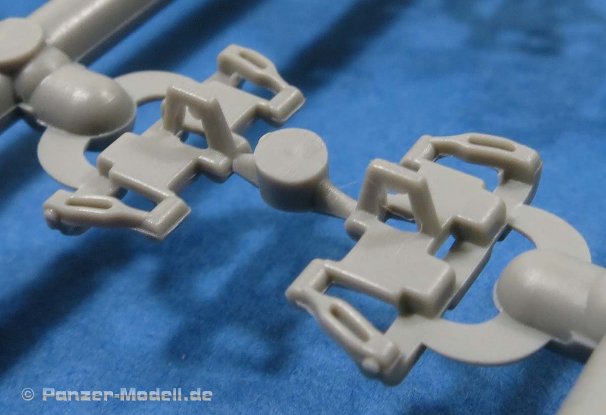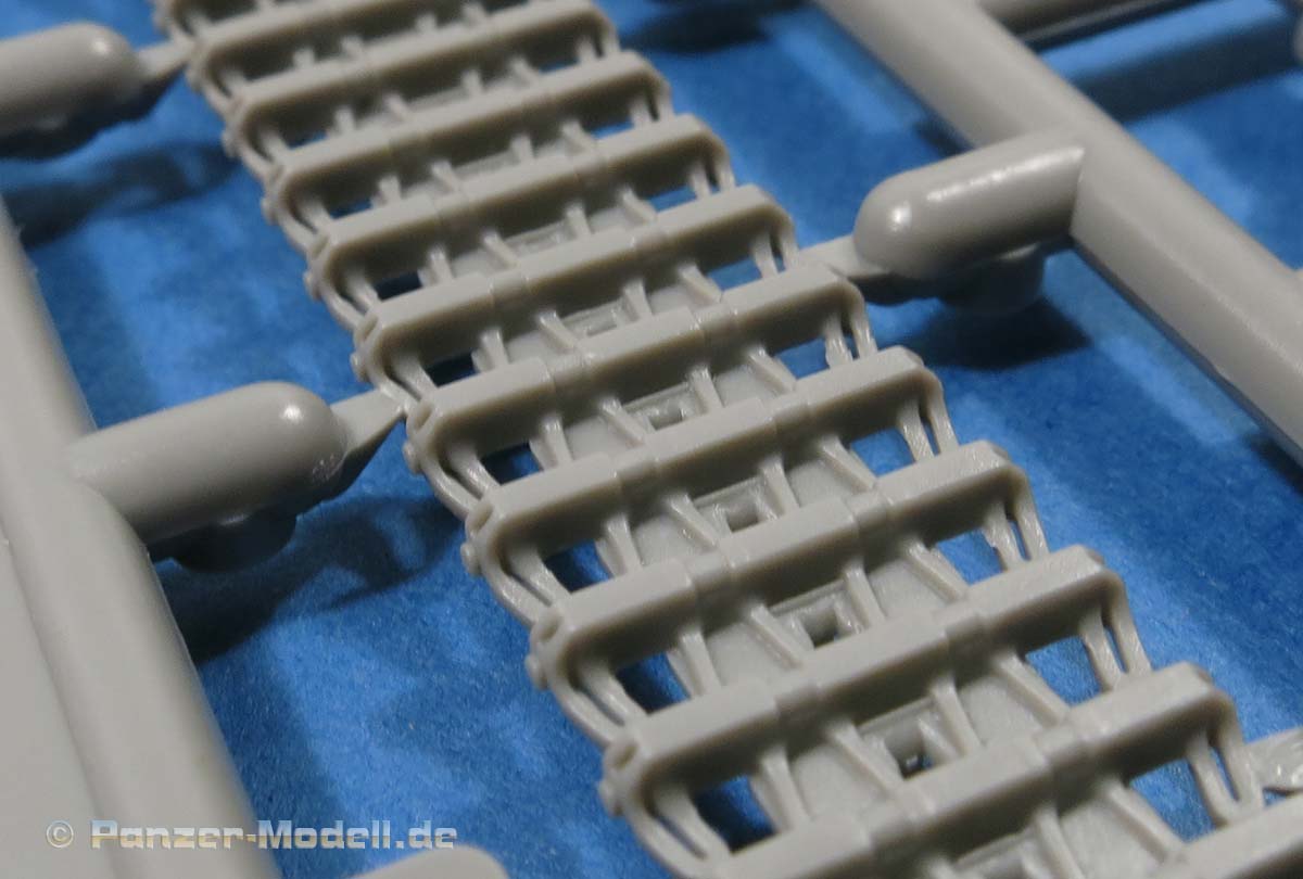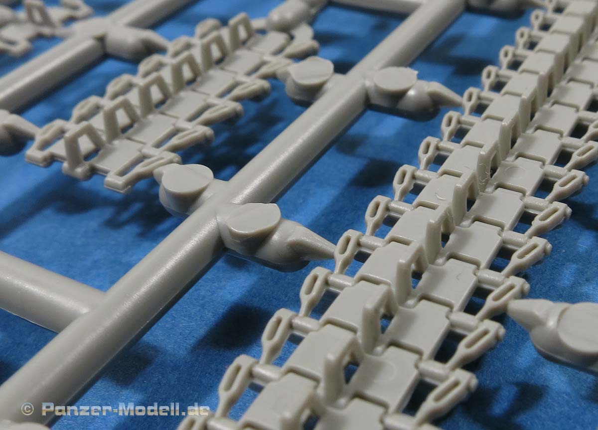 Die Kette liegt als Segmentkette bei - die Einzelglieder und Stränge sind sehr gut gemacht. Sauber und mit feinen Strukturdetails. Und am allerfwichtigsten, keine fiesen Auswerferstellen! Der obere Kettenstrang ist auch schon mit leichtem Kettendurchhang gespritzt.