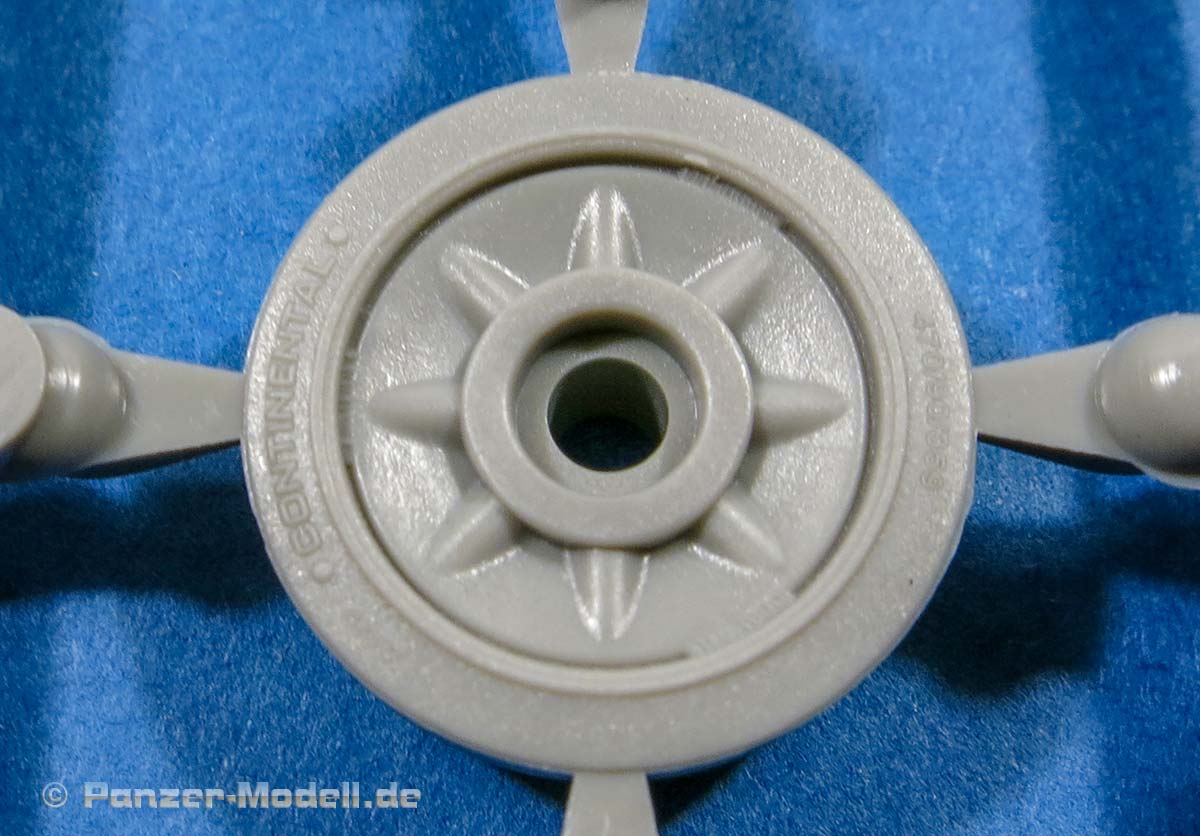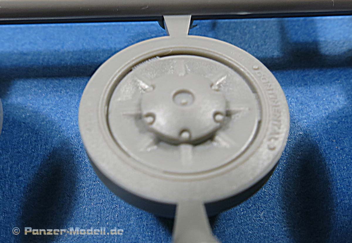 Das Laufwerk ist ebenfalls sehr Modellbauerfreundlich gestaltet. Die Laufrollen aus nur zwei Teilen, die Blattfedern mit Wannenhalterung in nur je drei Teilen und dennoch mit schönen Details. Die Laufrollengummis weisen die sehr schönen und feinen Herstelleraufdrucke "Continental" auf. Interessanterweisel liegt noch ein zweites Set Laufrollen ohne Nabendeckel bei ... womöglich kommen da noch weitere Versionen des Panzer IV.