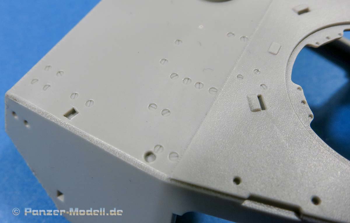 Für die Frontpartie der Wanne stehen zwei Optionsteile bereit, einmal die frühe aufgenietete Extrapanzerplatte, einmal die glatte, geschweißte Platte.