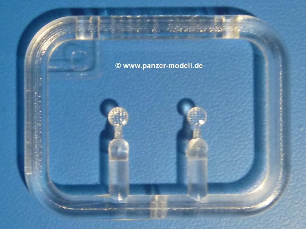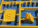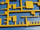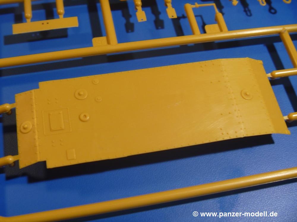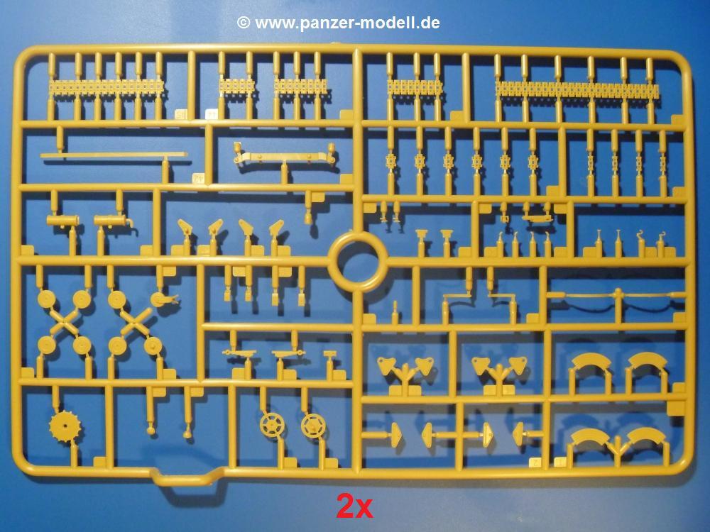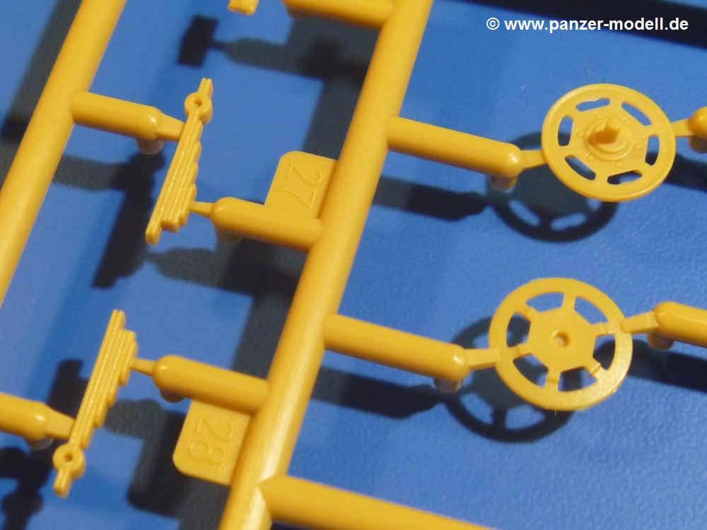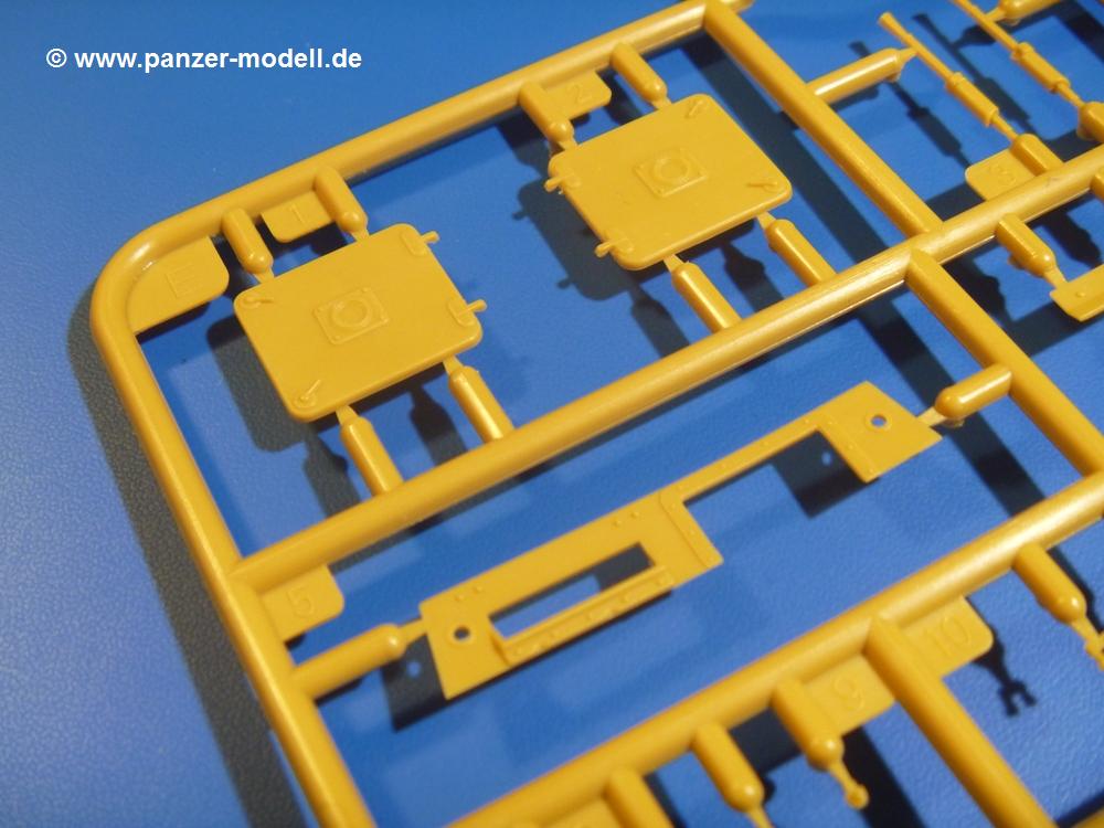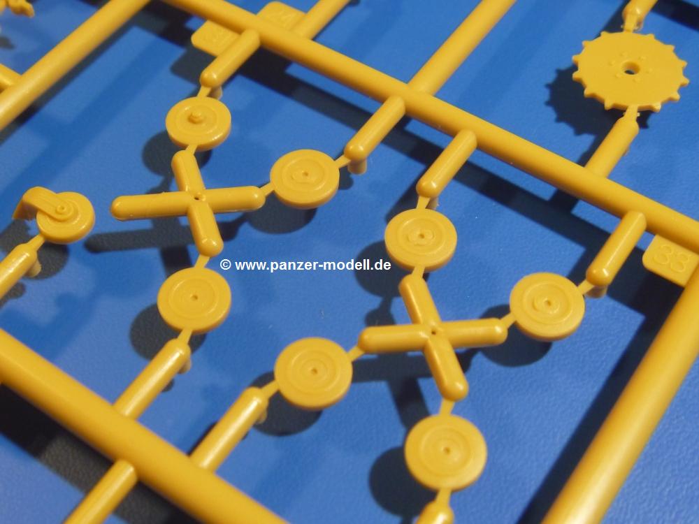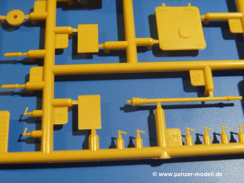 Alle Teile sind, wie bei Bronco üblich, sauber gespritzt, ohne Sinkstellen, Versatz, Fischhäute oder nennenswerten Grat. Einige Auswerferspuren sind zu finden, die sich zumeist an verdeckten Stellen befinden.Die Spritzlinge kennt man größtenteils aus den Vorgängerbausätzen. Man braucht nur nicht alle Teile. Spritzling F enthält die Teile für die Kanonenversion.Die Unterwanne setzt sich aus 6 Teilen zusammen. Entsprechende Passstifte sorgen dafür, dass alles gut zusammen kommt. Jede Menge Nieten und Schraubenköpfe sind zu finden. Auch die Bodenplatte ist damit versehen und zeigt zudem noch einige Wartungsdeckel.Das Fahrwerk des Winzlings dürfte die meiste Arbeitszeit in Anspruch nehmen, denn jeder der 4 Laufrollenwagen ist in 11 Teile aufgebrochen. Der Kettenspanner, das Spann- und schöne Speichenleitrad, machen noch mal 8 Teile, Antriebszahnrad und Achse 4, Kettenstützbalken und Halterung 4 und die Verbindung der Laufrollenwagen untereinander und mit der Wanne noch mal 2 Teile aus. Die grad mal 5,5 mm schmale Kette besteht pro Seite aus 5 größeren, 6 Dreiersegmenten und 4 Einzelgliedern. Bei den Ersatzrollen vom Spritzling F hat man die Wahl, diese entweder direkt an den Wannenseiten anzubringen oder man verwendet an den Stellen die Batteriekästen, auf die die Ersatzrollen aufgesetzt werden.Das Motordeck zeigt feine Lüftungsrippen, die Motorklappen erhalten feine, separate Flügelschrauben und können geschlossen oder offen dargestellt werden. Letzteres macht aber nicht viel Sinn, denn im Gegensatz zu den anderen CV33 Bausätzen bleibt der Motorraum leer. So erklärt sich auch der erheblich günstigere Preis. Auch der Kampfraum bleibt ohne Innenausstattung. Geöffnete Kampfraumklappen lohnen sich nur, wenn man beabsichtigt Figuren dort einzusetzen, denn sonst blickt man ins leere Innere. Statt der Zwillings-MG Blende kann man zwischen 2 Versionen der 20mm Kanonenblende wählen - glatt oder mit aufgeschraubter Zusatzpanzerung. Die Blende kann man höhenrichtbar einbauen, eine Seitenrichtung des schönen Kanonenrohrs mit ansatzweise aufgebohrter Mündung ist nicht vorgesehen.Bei den äußeren Anbauteilen sind der Wagenheber mit separater Kurbel und die Spitzhacke noch die grössten Teile. Die beiden Auspufftöpfe bestehen aus je zwei Hälften und befinden sich jeweils an den Heckseiten. (PS: Als Schalldämpfer sind diese Töpfe wohl nicht gedacht, denn die L35 brummt wie ein Großer. Siehe und höre hier: TANKETTE ITALIANO MOD.35) Winzige Schlepphaken und -ösen wollen noch an ihren Platz. Auch die Fahrscheinwerfer mit schönen Glaseinsätzen protzen nicht mit Größe.Der Decalbogen erlaubt 5 verschiedene Fahrzeuge: