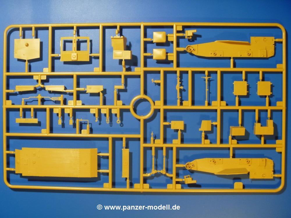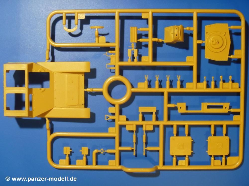 Das Fahrzeugkennzeichen setzt man aus dem weißen Grunddecal, der roten Regio Escercito Schrift und frei wählbaren, schwarzen Zahlen zusammen. Die Bauanleitung gibt allerdings für alle Decaloptionen das gleiche Kennzeichen an.Die teils farbige Bauanleitung erklärt den Zusammenbau in 17 Schritten. Dabei sind öfter zusätzliche Bilder zu finden, die die Anbringung mancher Teile etwas mehr verdeutlichen. Informationen zur Entwicklung und der Verwendung des Fahrzeugs in Englisch und Chinesisch, sowie die Farbangaben bei Verwendung von Mr. Hobby, Hobby Color, Humbrol und Tamiya Farben finden sich gleich am Anfang, gefolgt von einer Spritzlingübersicht. Grund- und Detailbemalung füllen die letzten Seiten.Ein Bausatz von guter, bekannter Bronco-Qualität. Verwöhnt durch die ersten Bausätze mit Motor- und Kampfraumausstattung fehlen mir die Innereien, andere mögen ggfs. froh darüber sein. Dafür ist der Preis um ca. 15,- EUR günstiger. Auf alle Fälle eine nette Variante, die nicht in der Sammlung fehlen sollte.