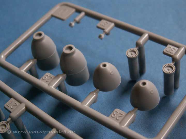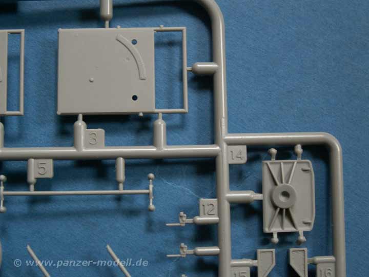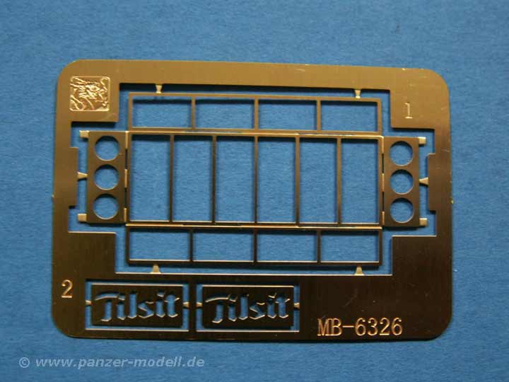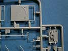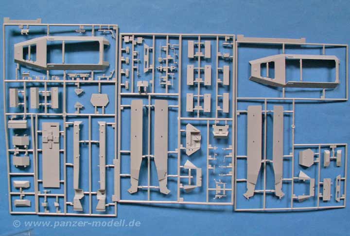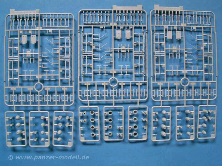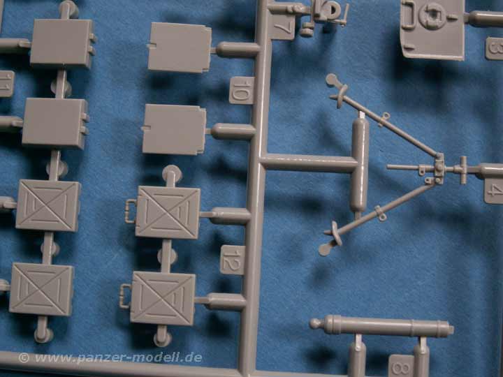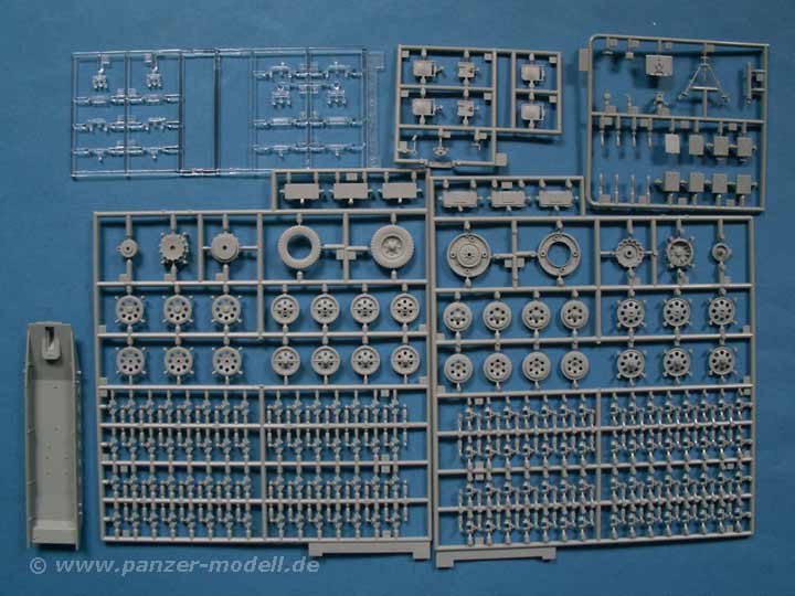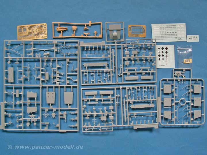 An Teilen finden sich im Karton die normale Oberwanne und die genietete Version. Desweiteren die gewohnte 251er Wanne mit Laufwerk und Anbauteilen, sowie PE Teile für Munitionskastenhalterung und (besonders nett) zwei Sprühschablonen für den Schriftzug "Tilsit" für die Wurfrahmenversion. Natürlich fehlen auch nicht die ganzen anderen schönen Gimmicks, wie die extra angepasste Fahrerfigur aus Softvinyl, die Metallpeilstangen, die Silbersticker für die Rückspiegel, drei verschiedene Sitzvarianten für Fahrer und Beifahrer, zwei Decalbögen und vor allem die Klarsichtteile für die Glasblöcke der Sichtluken.
