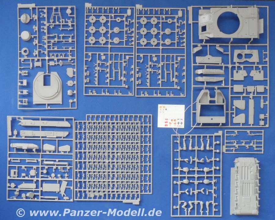Alle Luken des Panzers können offen dargestellt werden und laden geradezu zu der Inneneinrichtung von Tracks ein, wenn man sie denn noch irgendwo her bekommt. Die Vierlingsflak ist höhenrichtbar und soweit ganz ordentlich detailiert. Nur die Rohre sollten unbedingt gegen die RB-Rohre ausgetauscht werden. Ansonsten ist der Bausatz sehr übersichtlich und leicht zu bauen. Das Highlight sind aber sicherlich die Decals! Nicht weniger als neun (9!!!) Versionen sind enthalten! U.S.S.R, Irak, NVA der DDR, NVA Nordvietnam, Libanon, Czechoslowakia, Polen, Ungarn und Syrien. Damit kann das Fahrzeug in fast jeden größeren Konflikt der letzten 40 Jahre eingebaut werden! Die vier Figuren sind alte und gute Bekannte. Ursprünglich als Besatzung für einen BTR gedacht passen sie aber auch zu allen anderen Fahrzeugen. Und wer keinen Russen baut hat noch was für die Restekiste!