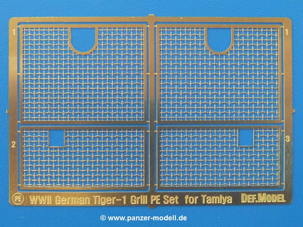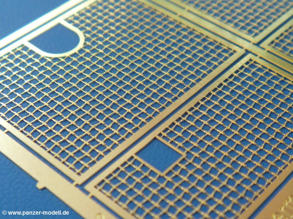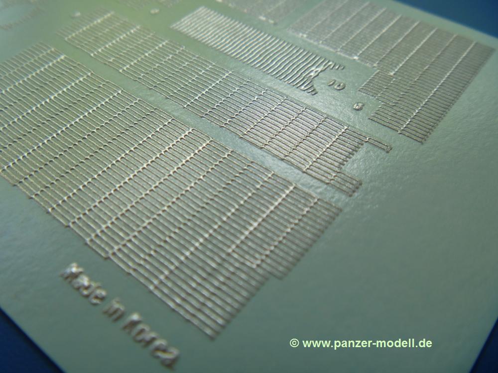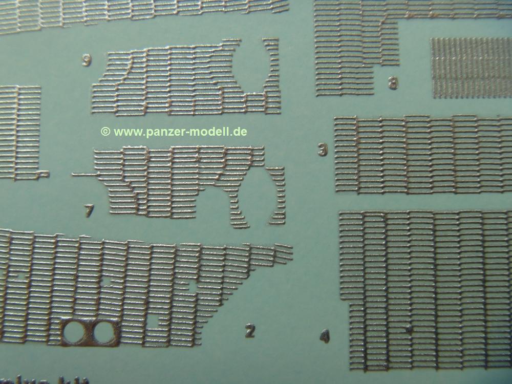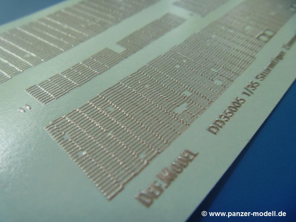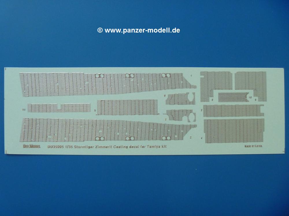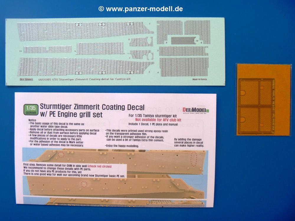 Für meinen zweiten Tamiya Sturmtiger (Tamiya Nr. 35177) bin ich einer Empfehlung eines Freundes gefolgt und habe mir mal das DEF.Model Zimmerit Set besorgt. Im Set enthalten sind Zimmerit Seiten-, Bug und Heckteile für die Wanne. Das Besondere - es handelt sich dabei auf Decalfolie gespritztes Resin. Wer also mit Decals umgehen kann, sollte also auch hiermit gut zurechtkommen. Löcher für Kettenblechverschraubungen und Werkzeughalterungen sind bereits vorhanden. Man muss nur der Anleitung folgend am Tamiya-Modell zwei Angüsse entfernen. Die Zimmeritstruktur ist gut, wenn sie mir auf den ersten Blick etwas zu regelmässig erscheint, aber am Modell und nach Bemalung bekommt man sicher ein gutes Endergebnis. Als kleines Extra sind die Motorlüftergitter aus PE-Teilen mit dabei. Sie geben die Gitterstruktur gut wieder und man erspart sich einen Extra-PE Satz.Für etwas über 10,- EUR bekommt man Zimmerit und Gitter im deutschen Handel - ein echtes Schnäppchen.