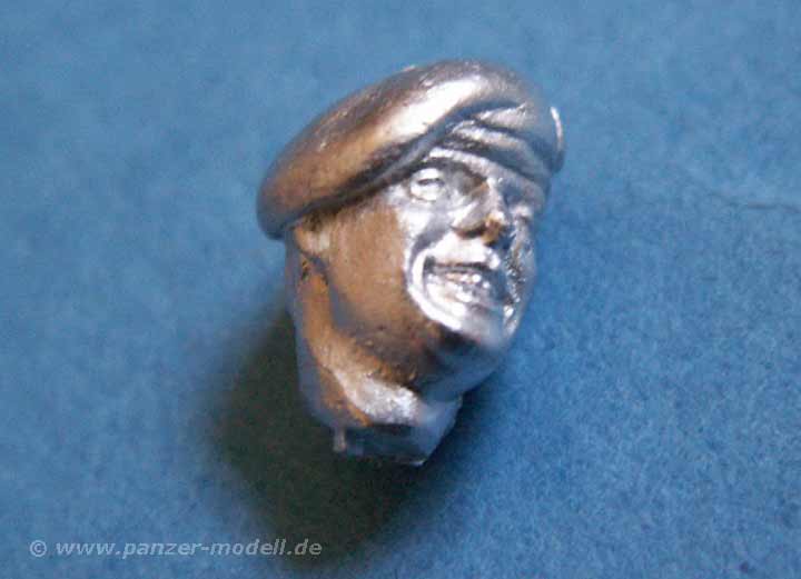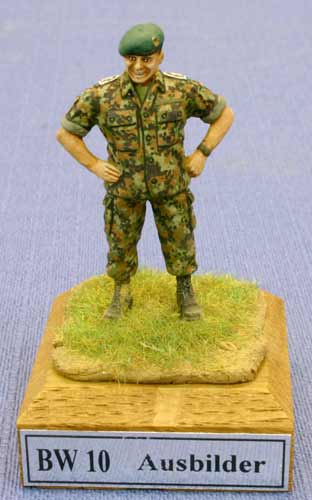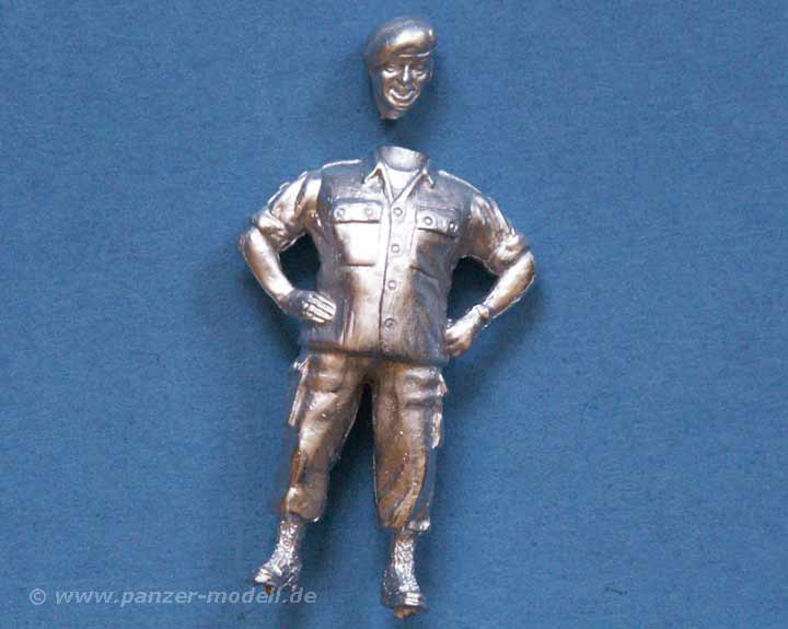 Diese Figur besteht angenehmerweise aus nur 2 Teilen. Der Körper ist komplett mit Armen und Beinen. Nur der Kopf, der ein Barett trägt, ist einzeln. Diese Figur stellt einen Ausbilder dar, der mit seinen Armen in die Hüfte gestemmt steht. Die Hände sind etws "flach" im Detail, die Figur an sich ist etwas stämmiger mit Bauch ausgefallen - daher vielelicht auch etwas weniger Faltenwurf.