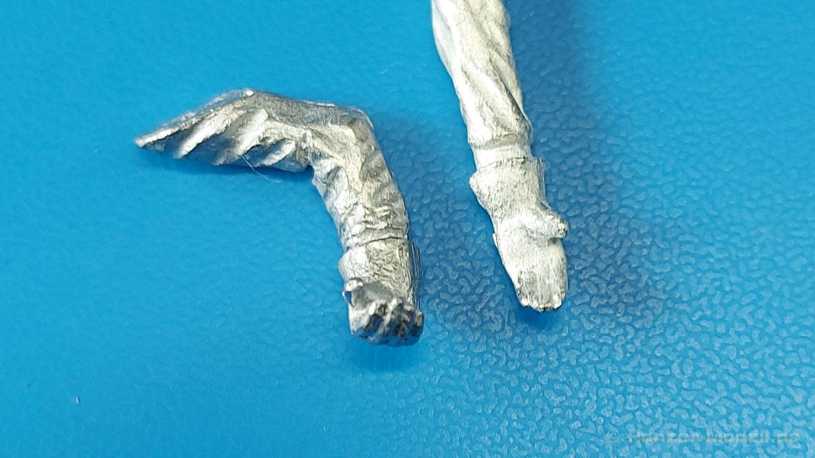Die vorliegende Figur stellt einen Bergewart dar, der das Bergeseil eines Bergepanzers 2 mit beiden Händen führt/herauszieht. Die Figur besteht aus dem Körper, also Oberkörper inkl. Beinen, dem Kopf und den Armen. Die Bekleidung zeigt einen glaubhaften Faltenwurf. Der Soldat trägt eine Panzerkombi mit schräg gesetzten Reißverschlüssen der Brusttaschen und der Rückentasche für den Bergegriff, die deutlich zu erkennen ist. Er trägt kein Koppel über der Kombi, aber das Hüftzugband ist deutlich eingezogen (figurbetont). Die Hosenbeine gehen über die Schnürstiefel. Die Abdeckung der Reißverschlüsse der Unterschenkeltaschen sind gut sichtbar. Die Schnürung der Stiefel ist vorhanden. Sogar die Stiefelsohlen weisen ein Profil auf. Die Arme sind so gestaltet, dass die Figur das Bergeseil (nicht enthalten) von oben greifen kann. Finger und Daumen sind entsprechend gut gestaltet. An den Händen trägt er schwere Arbeitshandschuhe. Die Gesichtszüge und der Haaransatz sind deutlich getroffen. Auf dem Kopf sitzt das typische Barrett mit dem entsprechenden Barrettabzeichen. Die Oberfläche weist eine leicht raue Struktur auf, die Metallguss so eigen ist, aber nach Bemalung wird das nicht mehr auffallen. Der Faltenwurf und die Oberflächendetails sind recht schön. Hier und da findet sich feiner Gussgrat, der sich leicht entfernen lässt. Bergeszene voraus! Zwar zielt DOLP mit seiner Figur auf die letztens erschienenen Bergepanzer 2, aber zu einem Bergepanzer 1 (M88A1G) sollte sie auch gut passen.Die Figur ist für ca. 9 EUR auf dem deutschen Markt erhältlich. |