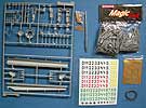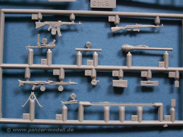 Insgesamt finden sich 659 Teile an 14 Spritzlingen, dazu PE Teile, Draht, ein gedrehtes Metallrohr, gedrehte Metallmunition, usw.
