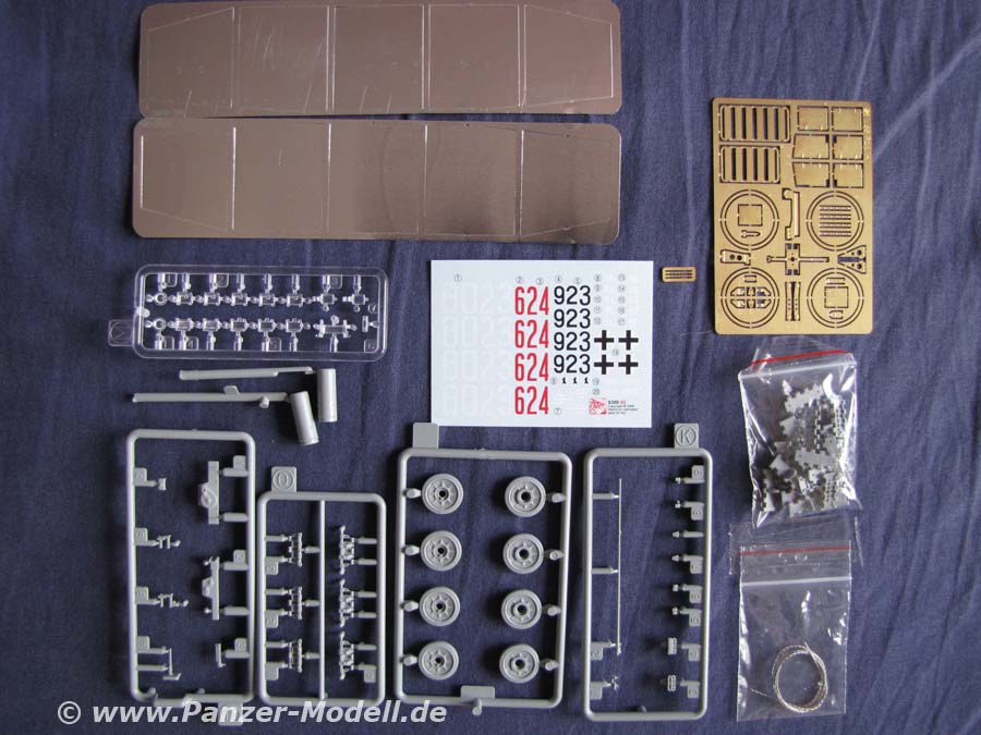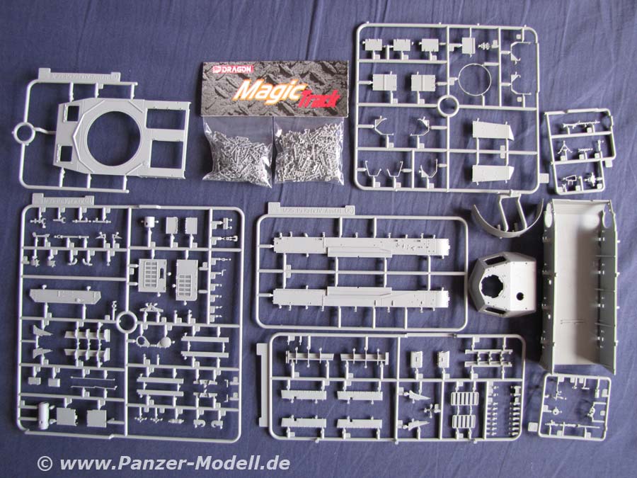 Der Bausatz umfasst über 800 Teile an über 20 verschieden großen Spritzlingen plus Unterwanne, Turm, PE Teile, vorgeschnittene Einzelgliedketten (Magic Tracks), Klarsichtteile, Metallkabel, PE Seitenschürzen und einem Decalbogen.