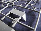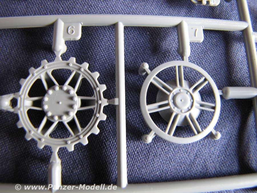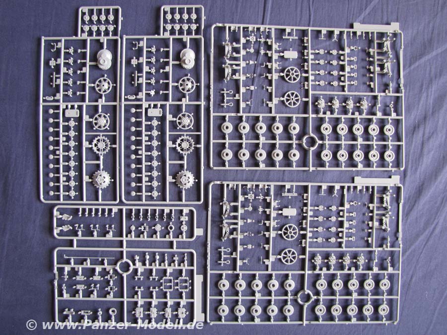 Die Qualität der Teile ist wieder mal aussergewöhnlich gut - einige Teile kennt man bereits von den vorhandenen Panzer IV Bausätzen, andere Teile sind entsprechend dieser Ausführung völlig neu. Die Detail sind sehr gut wiedergegeben, Auswerferstellen sind quasi nicht vorhanden (auf den Kettnglieder sieht man bei ganz genauem Hinsehen welche auf den Innenseiten) und es werden Teile wirklcih maßstäblich dünn in Plastik dargestellt, wie z.B. die Turmschürzen. Diese sind sogar für den hinteren Bereich als ein fertiges Teil gebogen und dünn dargestellt. Das erfreut das Auge!