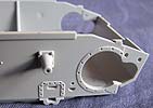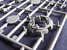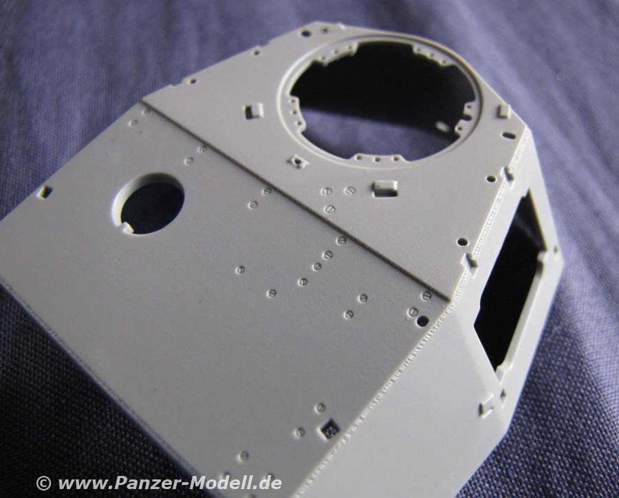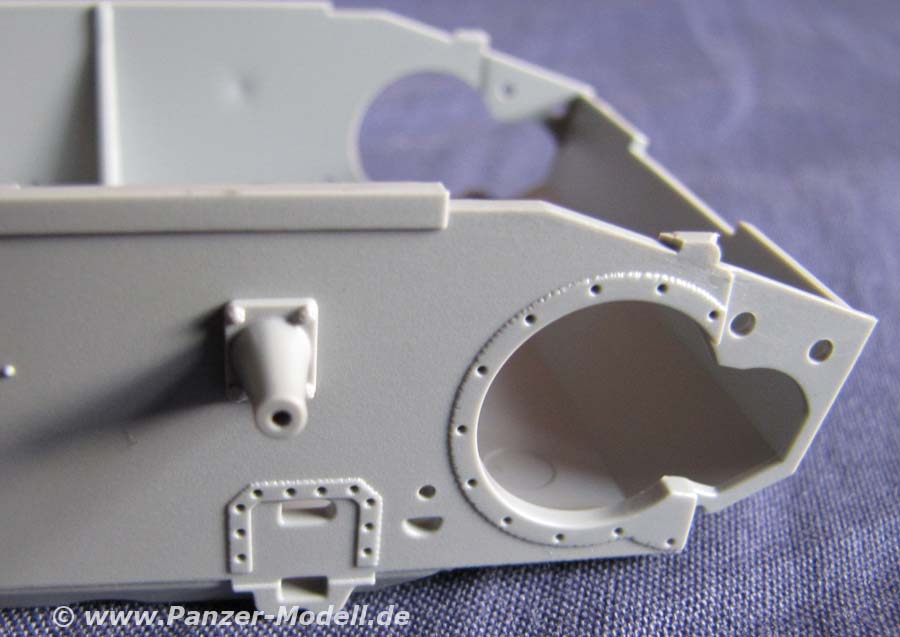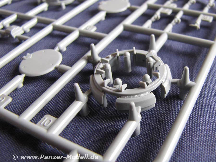 Die Halterungen für die Turmschürzen sind sauber und fein als Plastikteil dargestellt. Dies gilt auch für die Turmschürzen an sich. Die Seitlichen Luken kann man entweder als einzelnes Komplettteil geschlossen oder mit zwei Einzelteilen offen darstellen.