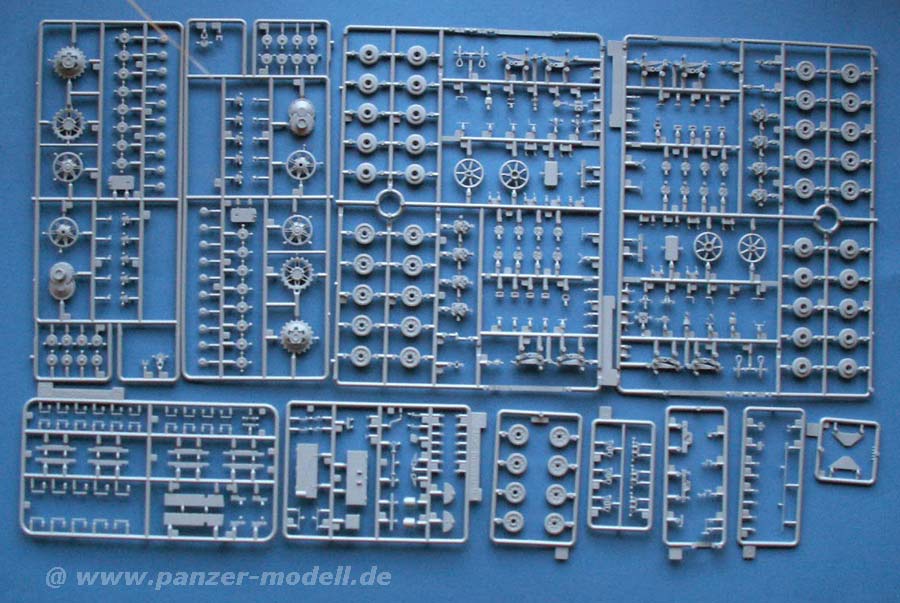 Im Bausatz enthalten sind über 800 Teile an über 15 mehr oder weniger großen Spritzlingen. Dazu gibt es natürlich die passenden Ketten als Magic Tracks, also die vorgeschnittenen Einzelketten, Fotoätzteile, Klarsichtteile, sehr feine, dünne Schürzenelemente aus PE Teilen, Metalldraht, die Unterwanne, der Aufbau und einen kleinen Decalbogen.
