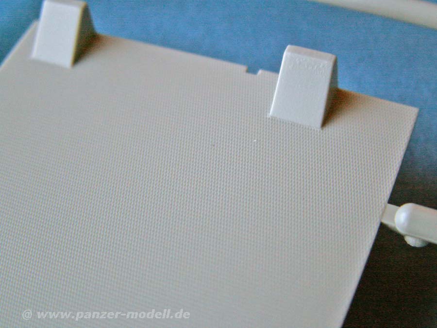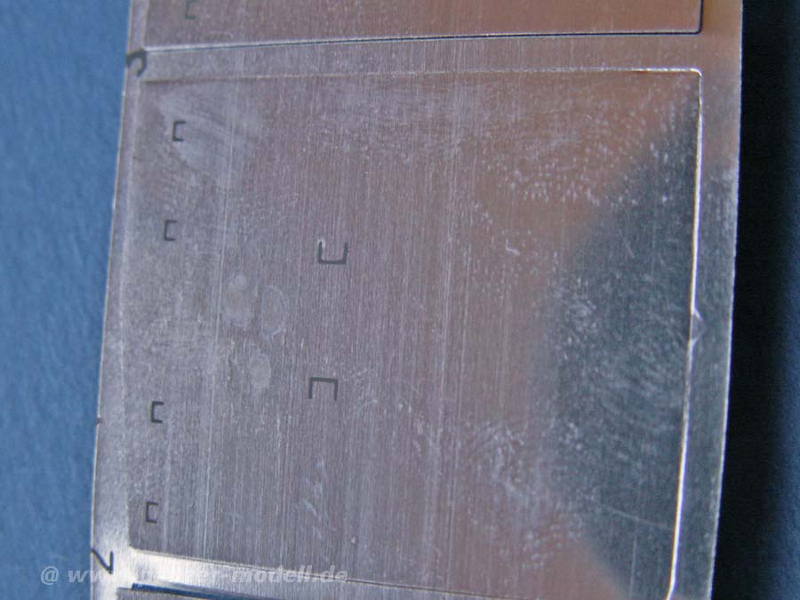 Wahlweise sind ebenfalls die Schürzenhalterungen der 2.Version mit den nach oben stehenden Dreiecken enthalten, die einen super Eindruck machen. Die Schürzenelemente sind aus extrem dünnem PE Blech mit aufgebrachten Markierungen für die Haltelaschen - soweit das Beste was ich je in puncto Schürzen gesehen habe. beschädigungen sind superrealistisch darstellbar und maßstäblich absolut korrekt, sowie durch die Machart der einzelnen Elemente am Fahrzeug auch mit einzelnen Schürzen darstellbar.