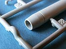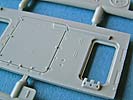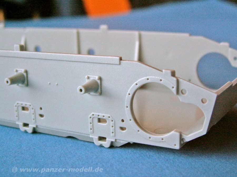 Einer der größten Pluspunkte dieses Bausatzes ist die Tatsache, dass der mehrseitige Aufbau in einem Stück gegossen wurde, wobei nur noch die Deckenplatte und weitere Anbauteile angebracht werden müssen - das ist Dienst am Modellbauer. Und dabei ist die Darstellung der Details phänomenal - gerade die Schweißnähte der verzahnten Panzerplatten an der Front sind genial gemacht. Auch die Pistolenstopfen sind schön gemacht mit feinen PE-Haltekettchen.