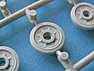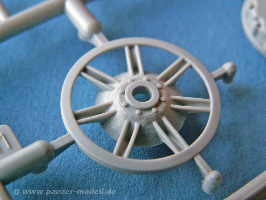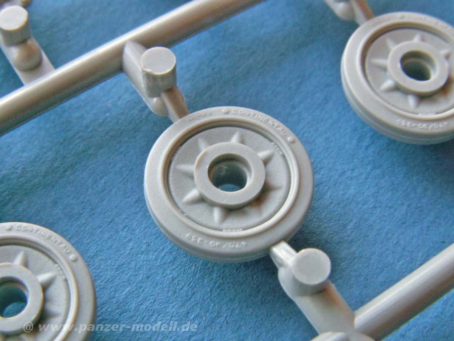 Die Unterwanne mit Laufwerk ist sehr gut und ansprechend gestaltet, das Leitrad weist sogar an der Nabe die obligatorische Gussstruktur auf, die in diesem Maßstab neu ist. Die Laufrollen an sich kennt man von früheren Panzer IV mit feinen Details, gerade die Beschriftung der Gummierung scheint noch feiner als zuvor zu sein - auch wenn der Hersteller aus Lizenzgründen noch immer "CONTINENTAU" heisst - dies ist aber fast nur mit Lupe zu erkennen. Die Kette ist aus den angenehm einfachen Magic Tracks zu machen, d.h. die einzelnen Glieder sind bereits versäubert und können direkt zusammengebaut werden.