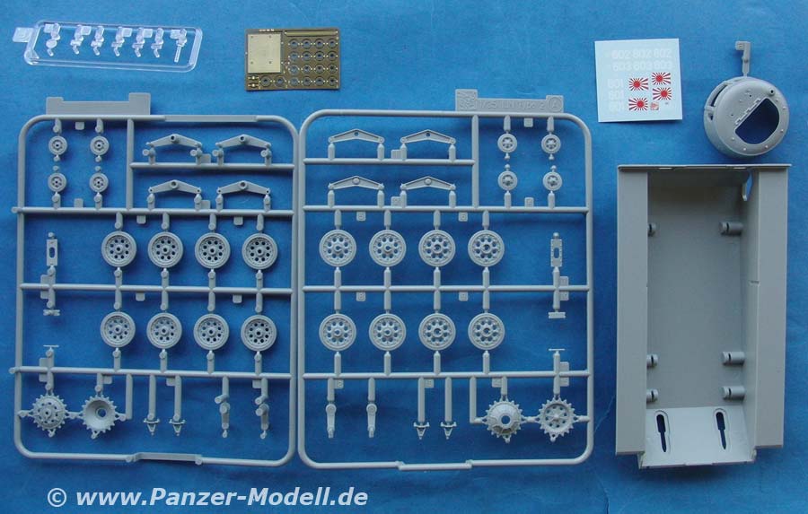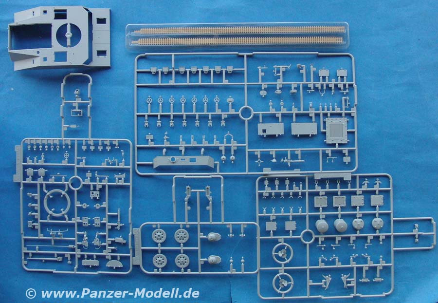 Im Bausatz enthalten sind über 240 Teile an 6 mehr oder weniger großen Spritzlingen, DS Tracks, Fotoätzteile, Oberwanne, Unterwanne, der Turm und ein Decalbogen.