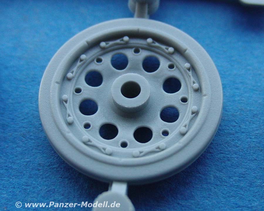 Das Laufwerk ist sehr schön dargestellt - die Laufrollen weisen sehr feine Rippen und Löcher auf - eine Augenweide. Die Kette ist zwar "nur" eine DS Kette, diese ist aber so fein und detailliert, dass es fast unglaublich ist, dass dies eine einteilige Vinylkette ist, die sich normal verkleben und bemalen lässt. und vor allem ist diese schnell und einfach aufziehen. Einziger Nachteil, den ich hier sehe - Kettendurchhang ist schwer darstellbar.