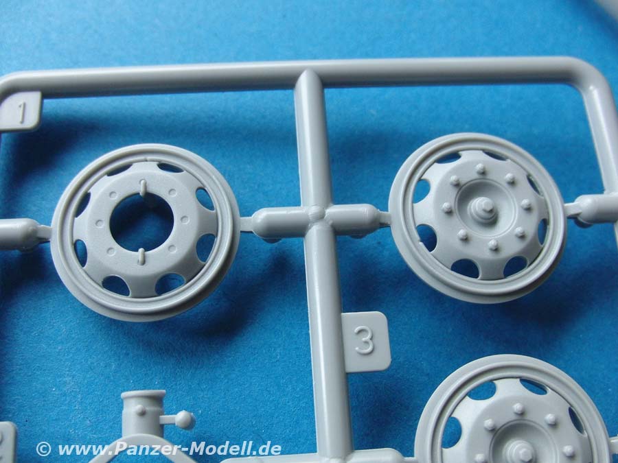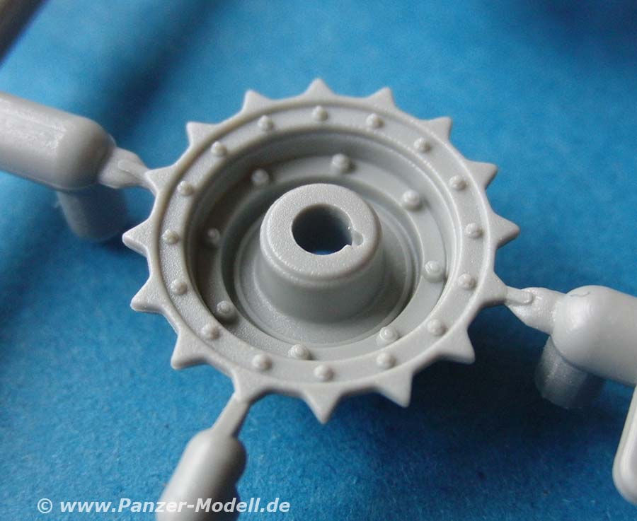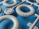 Das Halbkettenlaufwerk setzt sich ebenfalls aus ausgezeichnet dargestellten Laufrollen zusammen - diese sind vom Typ mit den vier Löchern. Die Kette ist eine Magic Track, d.h. die Kettenglieder sind bereits einzeln in einem Beutel und komplett versäubert, sodass man ohne Umschweife zum Zusammenbau schreiten kann.