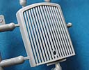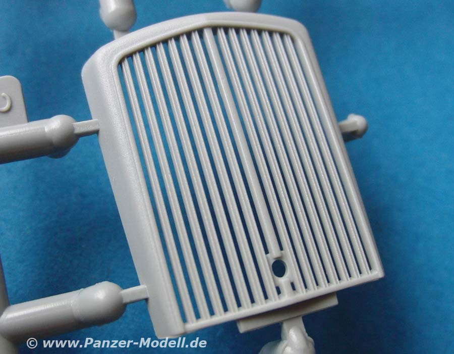 Erfreulicherweise liegt ein vollausgestatteter und schön detaillierter Motor samt Getriebe und Kühler bei. Damit macht es Sinn, dass der Kühlergrill vorn richtig durchbrochene Rippen hat. Und auch sonst ist das Motorhaubengerüst so ausgelegt, dass die gewinkelten Motorklappen offen anbaubar sind - wirklich schöne filigrane Arbeit.