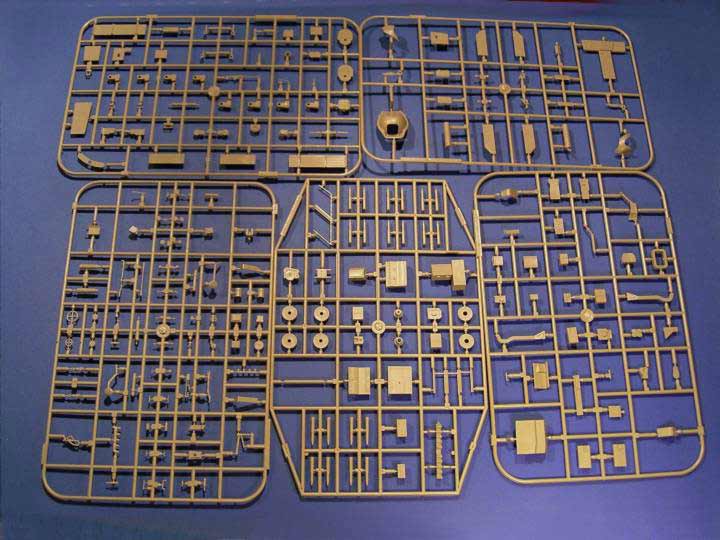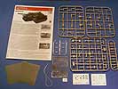 Zunächst fällt die große Schachtel mal auf, die sich beim öffnen als randvoll gefüllt herausstellt. In dieser befinden sich, 11 Spritzgussrahmen im hell-beige farbenem Plastik, 1 Spritzling mit den Klarsichtteilen für die Sichtblöcke, 2 Decalbögen und ein Bögen mit Aufklebern für das Instrumentenbrett. Weitere Highlights sind ein PE-Bogen, ein Satz Eduard-Mask für die die Laufrollen und ein Figurensatz bestehend aus 4 Figuren. Abgerundet wird das ganze durch eine farbige Bauanleitung, die man angesichts von 24 Seiten Stärke wohl als Anleitungsheft bezeichnen darf.