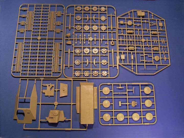 Ich habe den Bausatz bereits angefangen und kann deshalb etwas über den üblichen Rahmen eines Ausgepackt hinausgehen. Der Bausatz besteht eigentlich aus vielen kleinen Bausätzen im Bausatz. So sind sehr viele kleine Bauteile enthalten, die z.B. das bauen des Geschützes zur absoluten Frickelarbeit werden lassen.